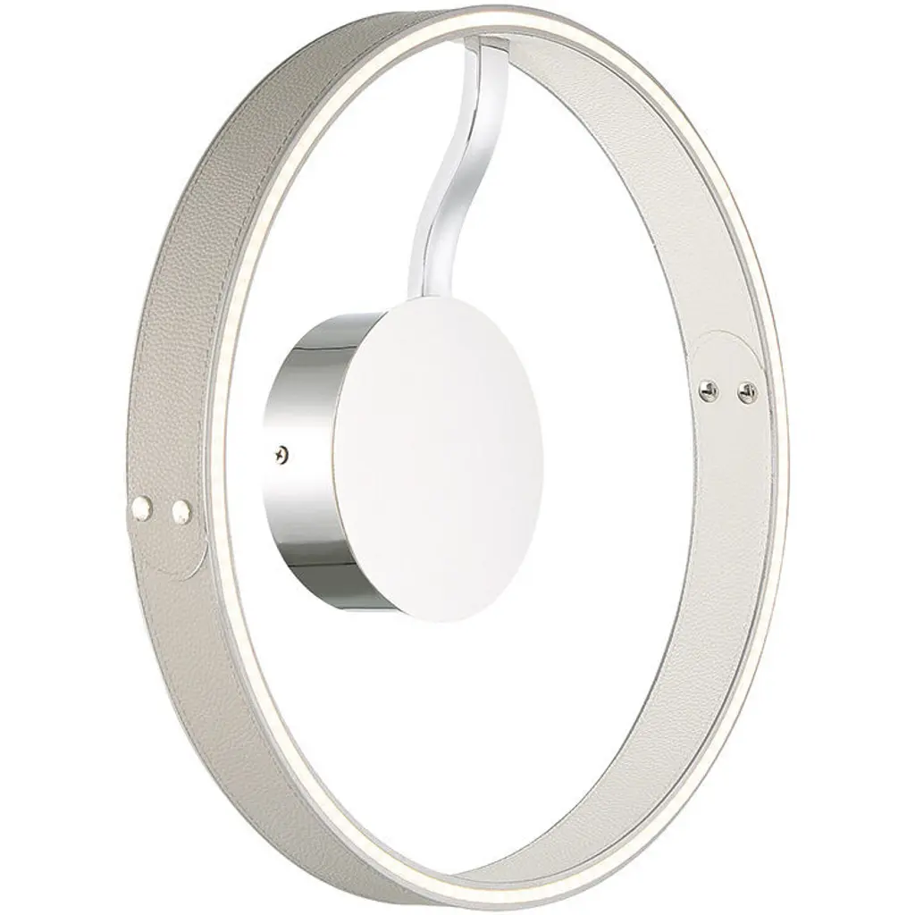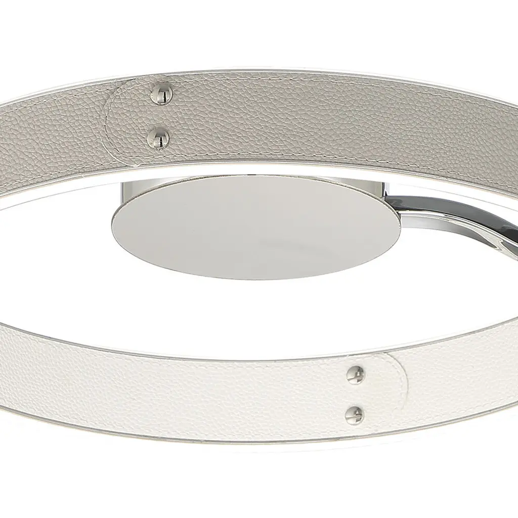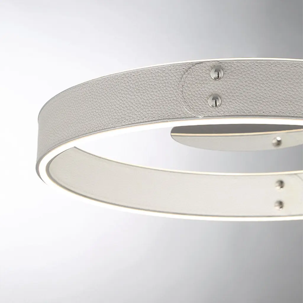 The Verdura collection features vegan leather, accentuated by decorative silver studs. The two-toned fabric highlights one color on the inside while displaying a complementary second color on the outer ring. The textured grooves are highlighted by the luminous glow of integrated LED lights that are encased between. This collection is not only abundant in size but also in the number of fixtures offered. Be it a small home office or a grand staircase, the Verdura collection is available in a range of fixture sizes to fit any room space.