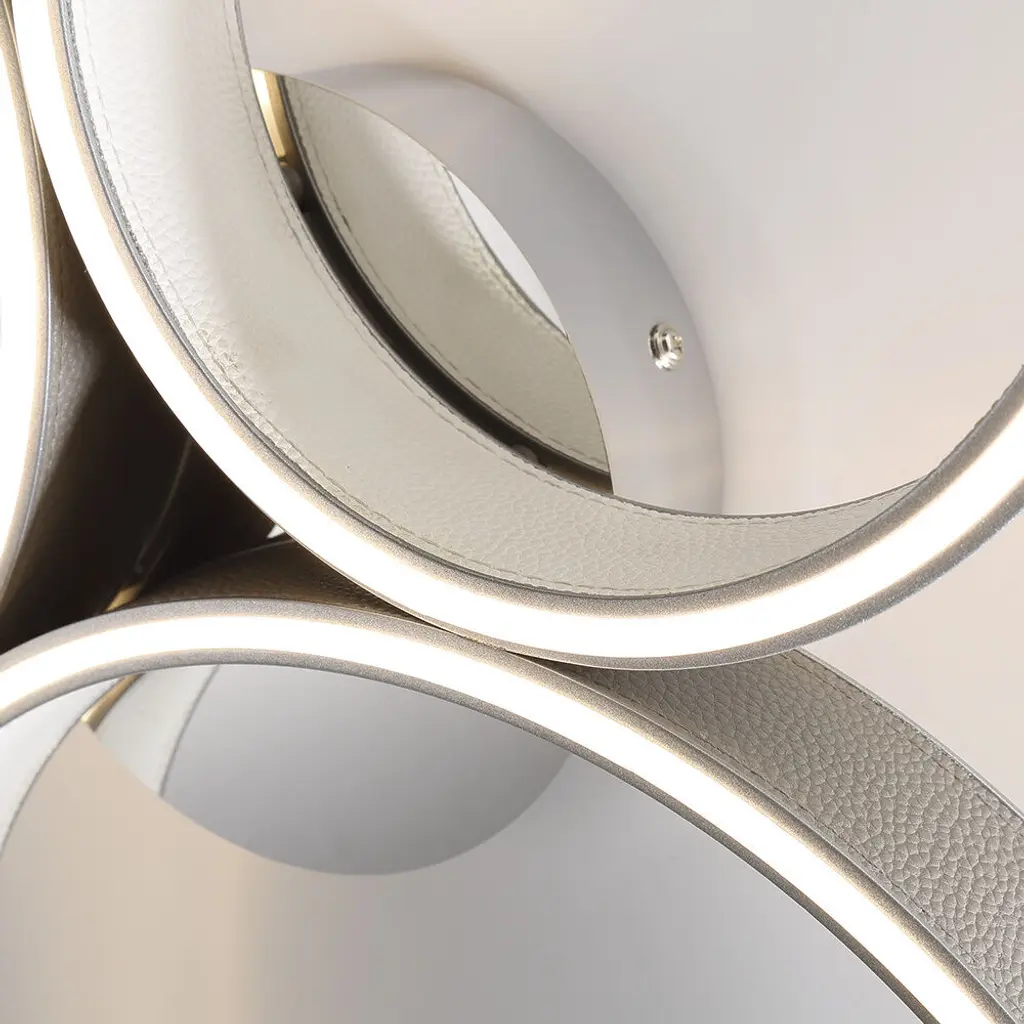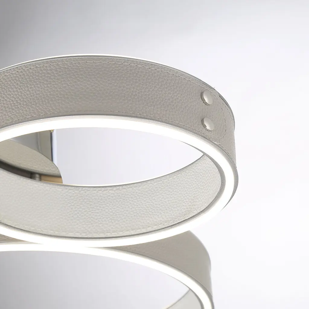 The Verdura collection features vegan leather, accentuated by decorative silver studs. The two-toned fabric highlights one color on the inside while displaying a complementary second color on the outer ring. The textured grooves are highlighted by the luminous glow of integrated LED lights that are encased between. This collection is not only abundant in size but also in the number of fixtures offered. Be it a small home office or a grand staircase, the Verdura collection is available in a range of fixture sizes to fit any room space.