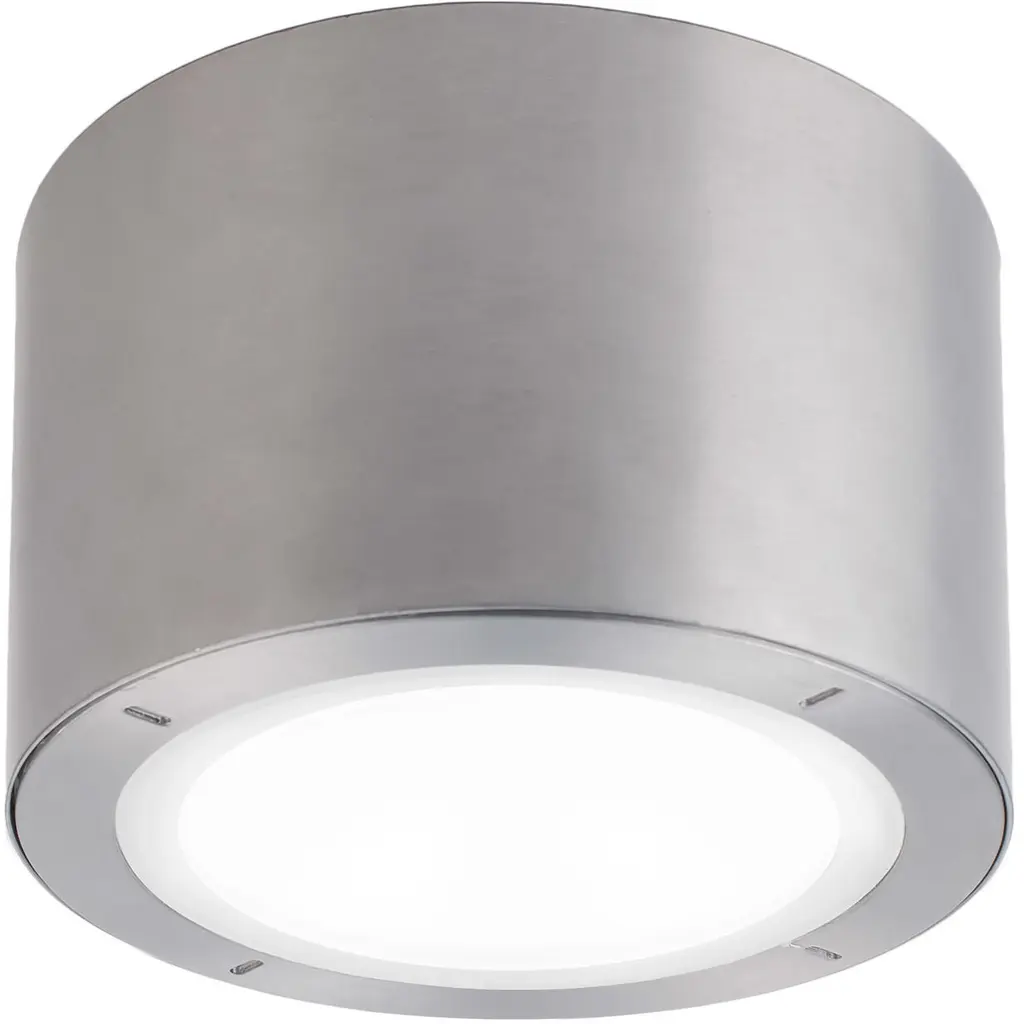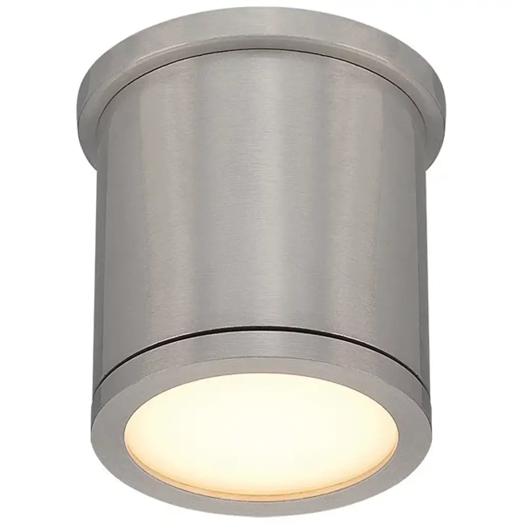 Complement the 21st-century look of your modern home with the versatile design of the Vessel LED Outdoor Flushmount from Modern Forms. The cylindrical piece is made in die-cast aluminum and finished with a neutral hue. A circular opening at the bottom is covered by a plate of silk-screened glass. The light from its energy-efficient LED travels past a built-in reflector and the glass diffuser, streaming out as a clean down glow.