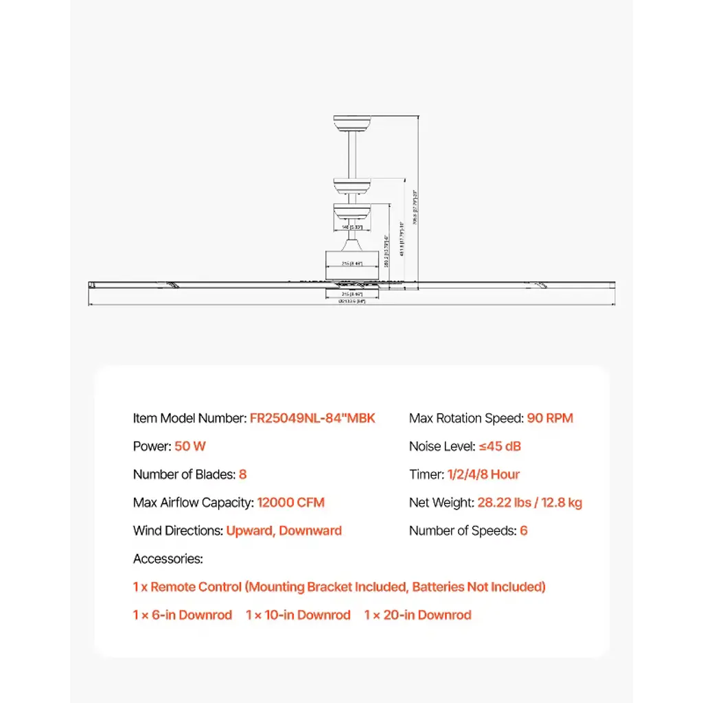 Feature: Built-to-Last Aluminum Blades: This durable ceiling fan boasts an 8-blade design that delivers stronger airflow compared to traditional 3-blade plastic fans. Crafted from sturdy aluminum, the blades ensure exceptional durability and provide consistently stable airflow, offering reliable performance for years to come. Quiet DC Motor: This bedroom ceiling fan features a high-efficiency DC motor with 53W high power, an airflow of up to 12000 CFM, and operates at a low noise level of ≤45 dB, providing you with a quiet and comfortable breeze.Even late at night, the low noise level won’t disturb your sleep, allowing you to enjoy a peaceful and cool summer night. Suitable for All Seasons: Whether it's spring, summer, autumn, or winter, this reversible motor ceiling fan meets all your needs. In summer, it rotates counterclockwise to enhance air circulation and cool down the room. In winter, it reverses to clockwise rotation, distributing warm air evenly for added comfort. Remote Control Operation: Equipped with a multifunctional remote control, our ceiling fan with light allows you to easily adjust the fan speed, timer, and other functions without having to get up, offering you an enjoyable airflow with convenience. Flexible Installation: One purchase includes 3 different sized down rods (6”, 10”, and 20”), accommodating various ceiling heights and ensuring a low-profile mount to various rooms. Package Content 1 x Ceiling Fan 1 x Remote Control (Mounting Bracket Included, Batteries Not Included) 1 x 6-in Downrod 1 x 10-in Downrod 1 x 20-in Downrod 1 x Accessory Kit