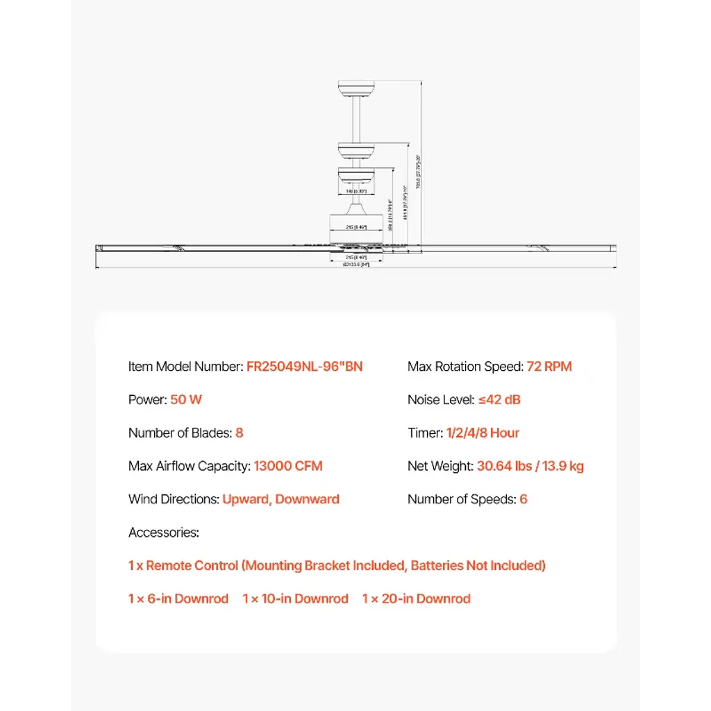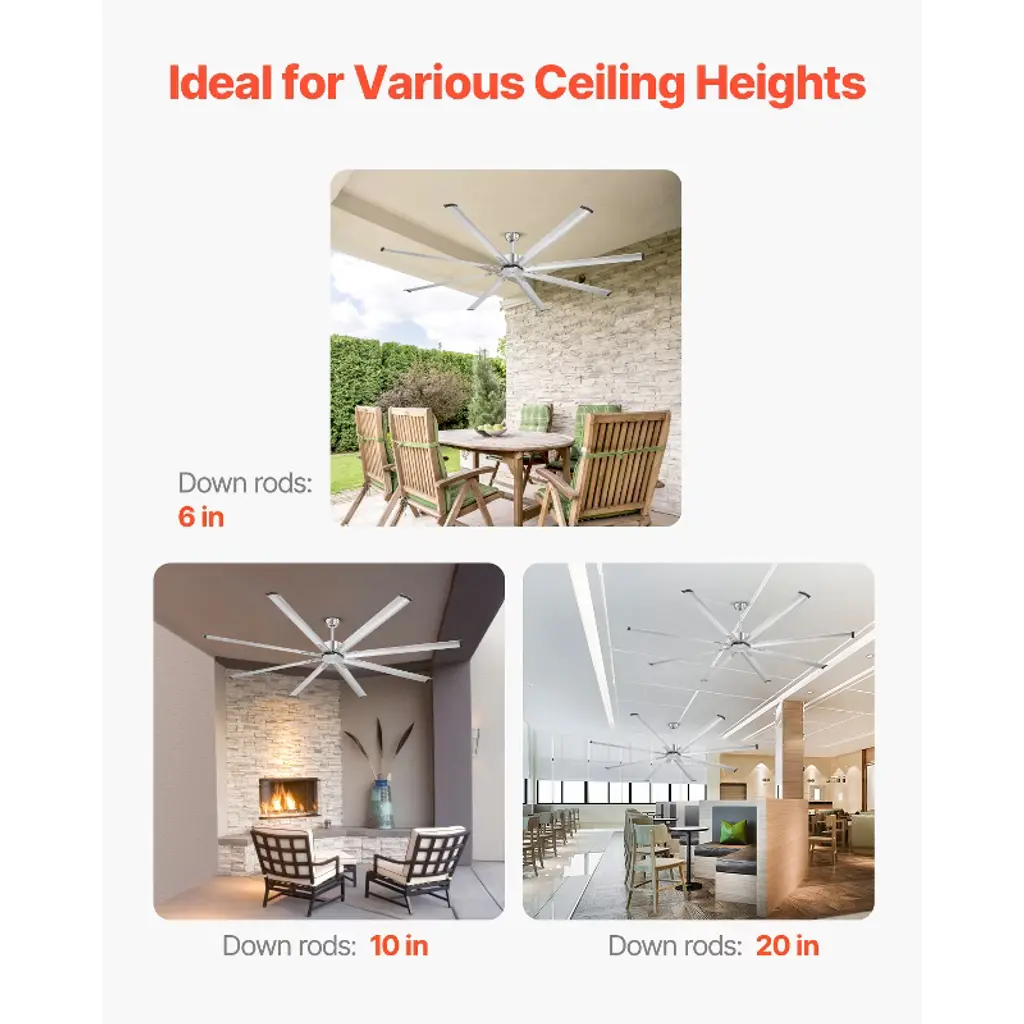 Feature: Built-to-Last Aluminum Blades: This durable ceiling fan boasts an 8-blade design that delivers stronger airflow compared to traditional 3-blade plastic fans. Crafted from sturdy aluminum, the blades ensure exceptional durability and provide consistently stable airflow, offering reliable performance for years to come. Quiet DC Motor: This bedroom ceiling fan features a high-efficiency DC motor with 54W high power, an airflow of up to 13000 CFM, and operates at a low noise level of ≤42 dB, providing you with a quiet and comfortable breeze.Even late at night, the low noise level won’t disturb your sleep, allowing you to enjoy a peaceful and cool summer night. Suitable for All Seasons: Whether it's spring, summer, autumn, or winter, this reversible motor ceiling fan meets all your needs. In summer, it rotates counterclockwise to enhance air circulation and cool down the room. In winter, it reverses to clockwise rotation, distributing warm air evenly for added comfort. Remote Control Operation: Equipped with a multifunctional remote control, our ceiling fan with light allows you to easily adjust the fan speed, timer, and other functions without having to get up, offering you an enjoyable airflow with convenience. Flexible Installation: One purchase includes 3 different sized down rods (6”, 10”, and 20”), accommodating various ceiling heights and ensuring a low-profile mount to various rooms. Package Content 1 x Ceiling Fan 1 x Remote Control (Mounting Bracket Included, Batteries Not Included) 1 x 6-in Downrod 1 x 10-in Downrod 1 x 20-in Downrod 1 x Accessory Kit