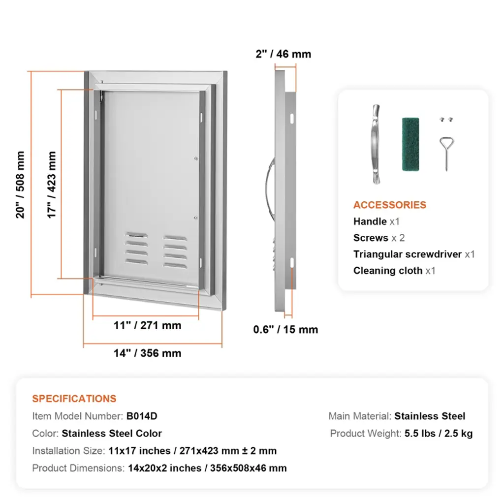 Feature: Precision Opening: Overall dimensions: 356x508x46 mm / 14x20x2 inches, installation size: 11x17inch/271x423mm, it is recommended to reserve an additional 0.08inch/2mm on this basis for better operation. The door is designed specifically for outdoor kitchens and barbecue islands, adding an elegant touch to your cooking area. With precise dimensions, it is easy to process, install, or dismantle. Available in various sizes and styles, it is perfect for indoor/outdoor kitchens and all other outdoor weather conditions. High-quality Materials: This access door is made of sturdy high-quality stainless steel, rust-proof and waterproof. You can clean it well without leaving any traces. The integrated thickened frame structure is durable, with a fully seamless design, no sharp corners. The unique U-shaped panel structure provides better strength and durability. Magnets at the top and bottom keep the cabinet tightly closed, effectively preventing insects from accessing your food or anything inside the cabinet. Left & Right Door Reversible Design: Adopting an L-shaped insert quick disassembly structure, the hinge can be removed for door direction adjustment. Doors open without blocking walls or hitting doors, eliminating the annoyance of left or right door openings, allowing you to adjust the direction according to your usage habits, making replacement convenient. Humanized Design: Delicate zinc alloy handles conforming to ergonomics, enlarged size for easy opening. The door frame edges are bent and thickened for safer use, providing a more user-friendly experience, allowing you to enjoy cooking in your outdoor kitchen without worries. It also equipped with louvred vents, allowing better air circulation in the storage compartment. Easy to Install: The external packaging prints a 1:1 installation perforated CAD drawing. You can follow the instructions to place the template where the bbq door needs to be installed and perforate according to the line drawing. It can be easily installed on any wall in minutes using embedded installation. Package Content 1 x Outdoor Kitchen Door 1 x Set of Accessories