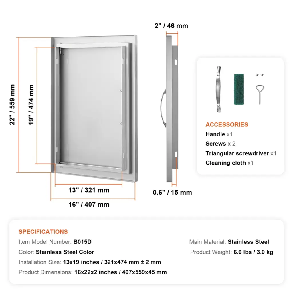 Feature: Precision Opening: Overall dimensions: 407x559x46 mm / 16x22x2 inches, installation size: 13x19inch/321x474mm, it is recommended to reserve an additional 0.08inch/2mm on this basis for better operation. The door is designed specifically for outdoor kitchens and barbecue islands, adding an elegant touch to your cooking area. With precise dimensions, it is easy to process, install, or dismantle. Available in various sizes and styles, it is perfect for indoor/outdoor kitchens and all other outdoor weather conditions. High-quality Materials: This access door is made of sturdy high-quality stainless steel, rust-proof and waterproof. You can clean it well without leaving any traces. The integrated thickened frame structure is durable, with a fully seamless design, no sharp corners. The unique U-shaped panel structure provides better strength and durability. Magnets at the top and bottom keep the cabinet tightly closed, effectively preventing insects from accessing your food or anything inside the cabinet. Left & Right Door Reversible Design: Adopting an L-shaped insert quick disassembly structure, the hinge can be removed for door direction adjustment. Doors open without blocking walls or hitting doors, eliminating the annoyance of left or right door openings, allowing you to adjust the direction according to your usage habits, making replacement convenient. Humanized Design: Delicate zinc alloy handles conforming to ergonomics, enlarged size for easy opening. The door frame edges are bent and thickened for safer use, providing a more user-friendly experience, allowing you to enjoy cooking in your outdoor kitchen without worries. Easy to Install: The external packaging prints a 1:1 installation perforated CAD drawing. You can follow the instructions to place the template where the bbq door needs to be installed and perforate according to the line drawing. It can be easily installed on any wall in minutes using embedded installation. Package Content 1 x Outdoor Kitchen Door 1 x Set of Accessories