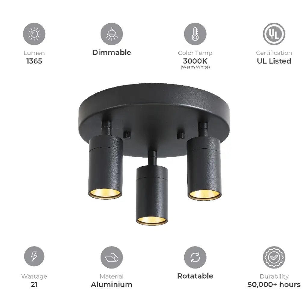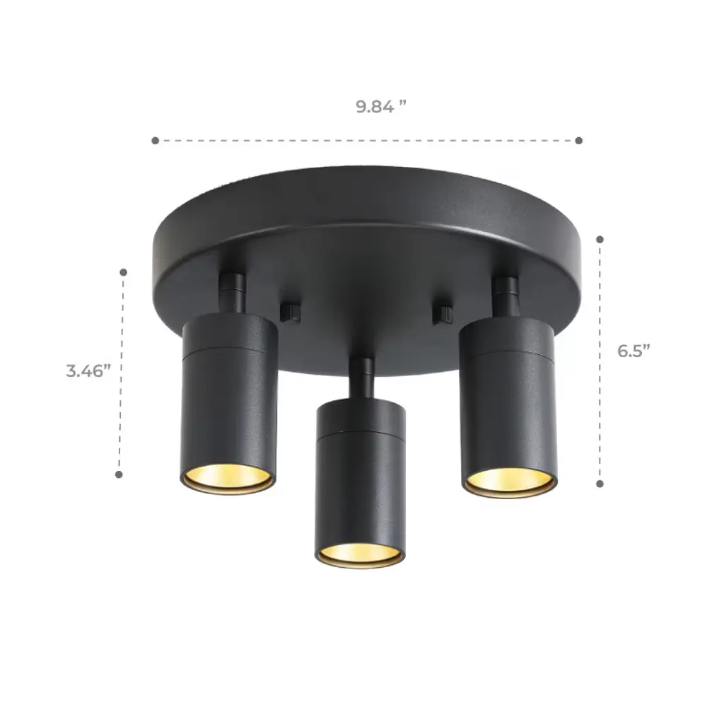 VidaLite LED Flush Mount is not only able to illuminate your room but it is also created to save money. Crafted from aluminum and iron, it is sturdy and eye catching. It features three dimmable spot light heads, each spotlight is brushed Black on the exterior, with a gold interior and inset LED light. The lights are situated on a flush mount and each head is individually adjustable in any direction to ensure you have light where it is needed most. Each LED light has 50,000 hours of maintenance free runtime so you can enjoy the light without worry of needing to change the bulb.