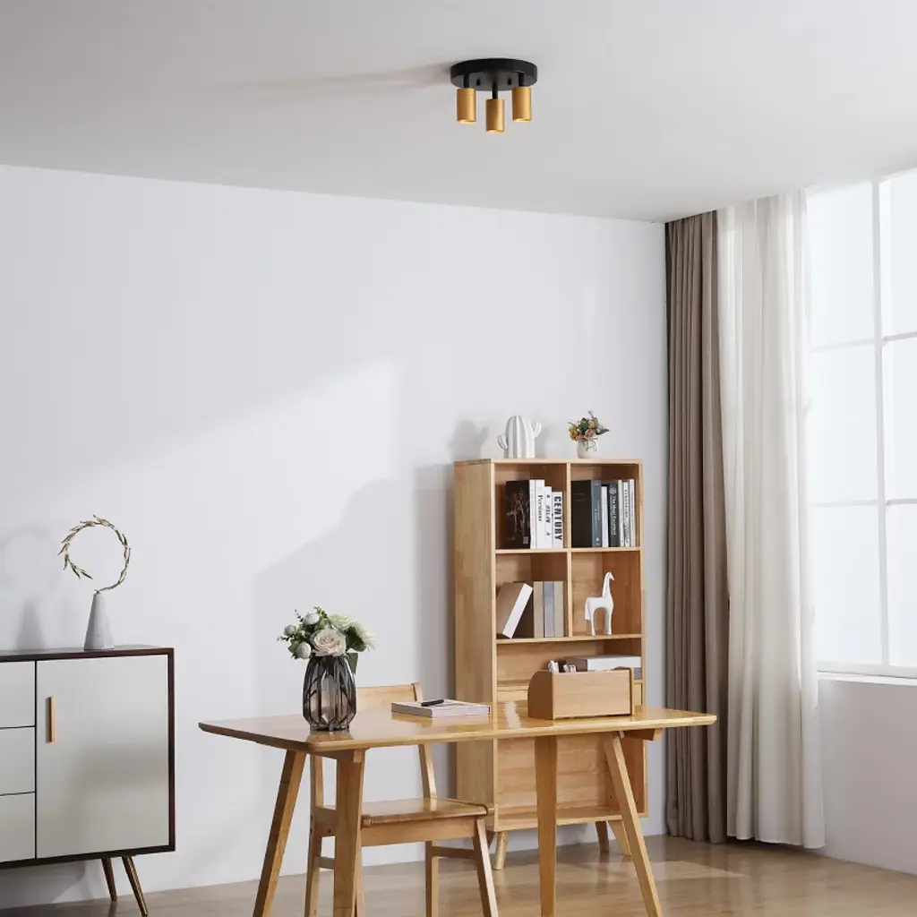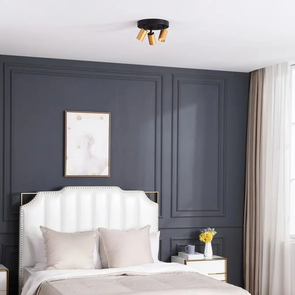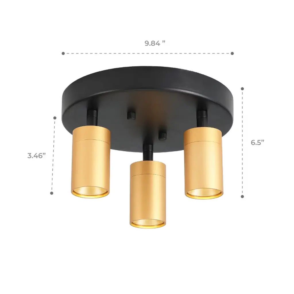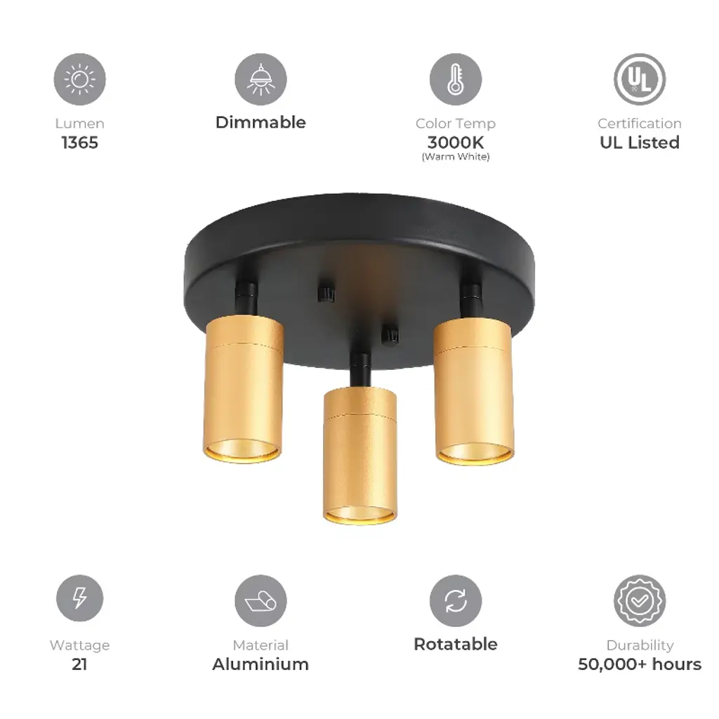 VidaLite LED Flush Mount is not only able to illuminate your room but it is also created to save money. Crafted from aluminum and iron, it is sturdy and eye catching. It features three dimmable spot light heads, each spotlight is brushed gold on the exterior, with a gold interior and inset LED light. The lights are situated on a flush mount and each head is individually adjustable in any direction to ensure you have light where it is needed most. Each LED light has 50,000 hours of maintenance free runtime so you can enjoy the light without worry of needing to change the bulb.
