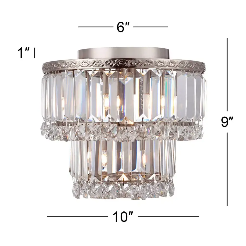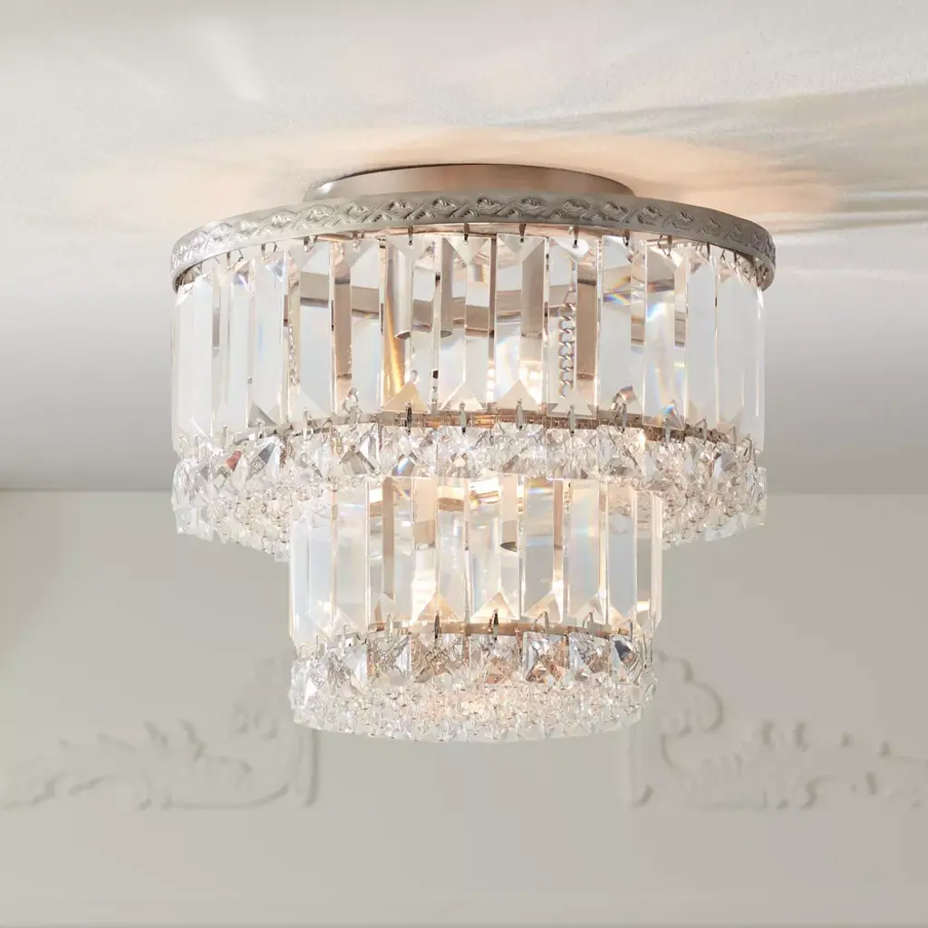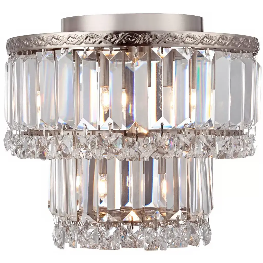 Add timeless elegance to your space with this clear crystal ceiling light and its sparkling shade made from prisms and faceted squares. A band of soothing satin nickel finish metal adorns the top of the tiered, upside down cake design. This flushmount accent brightens your home with three bulbs.
