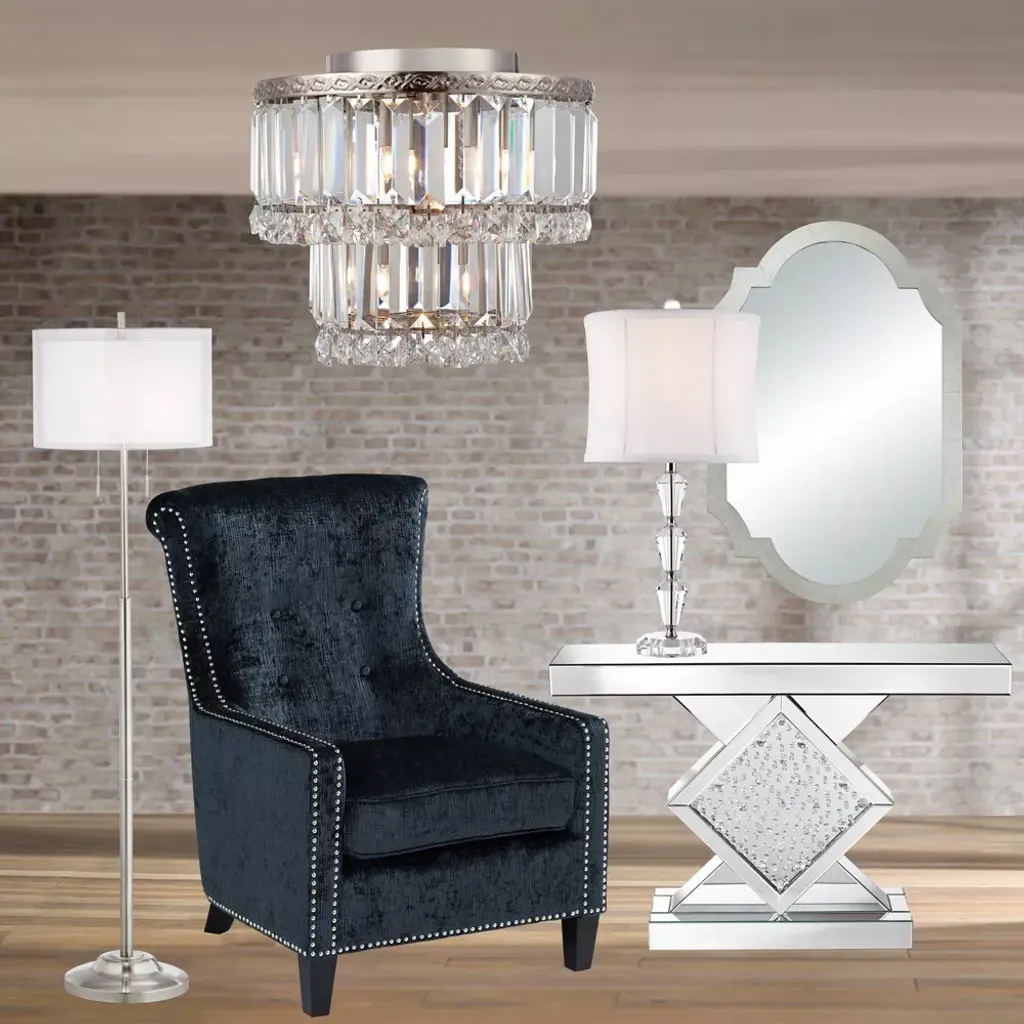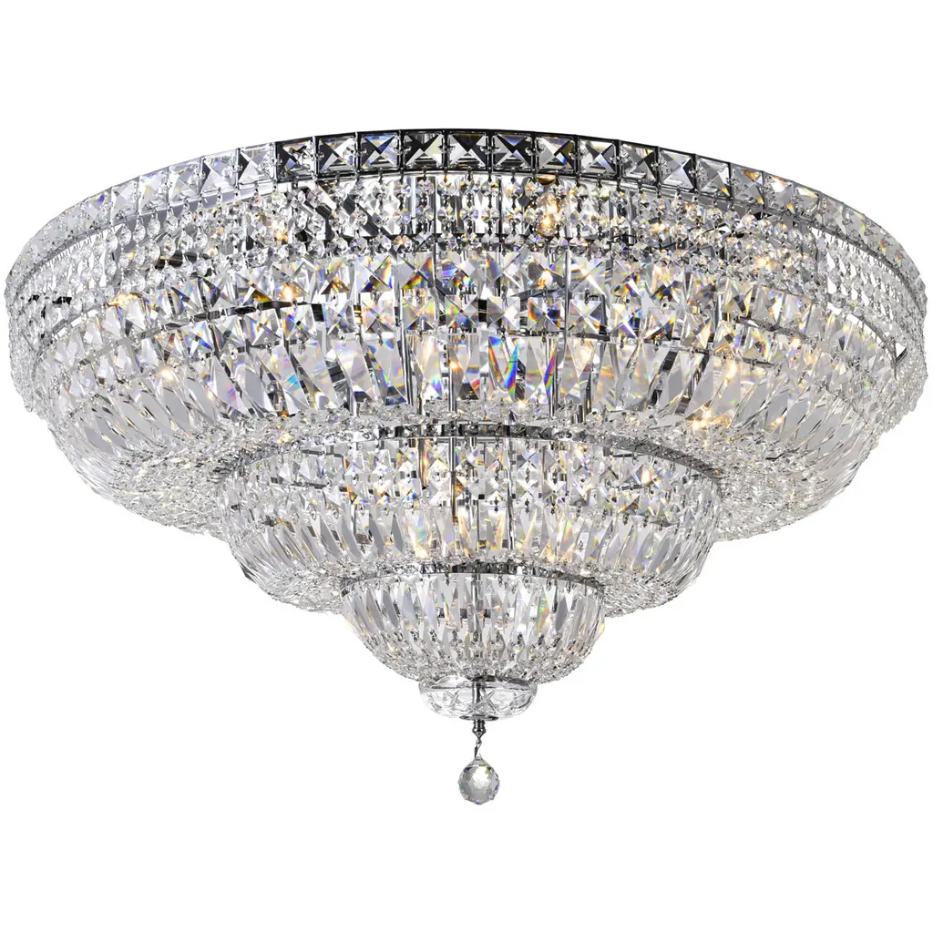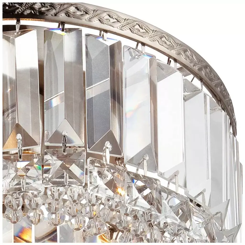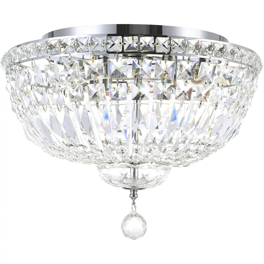 Add timeless elegance to your space with this clear crystal ceiling light and its sparkling shade made from prisms and faceted squares. A band of soothing satin nickel finish metal adorns the top of the tiered, upside down cake design. This flushmount accent brightens your home with three bulbs.