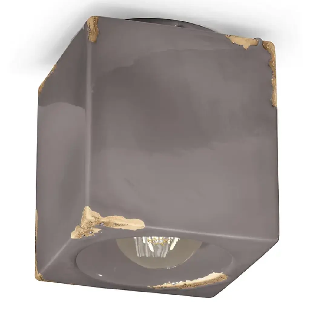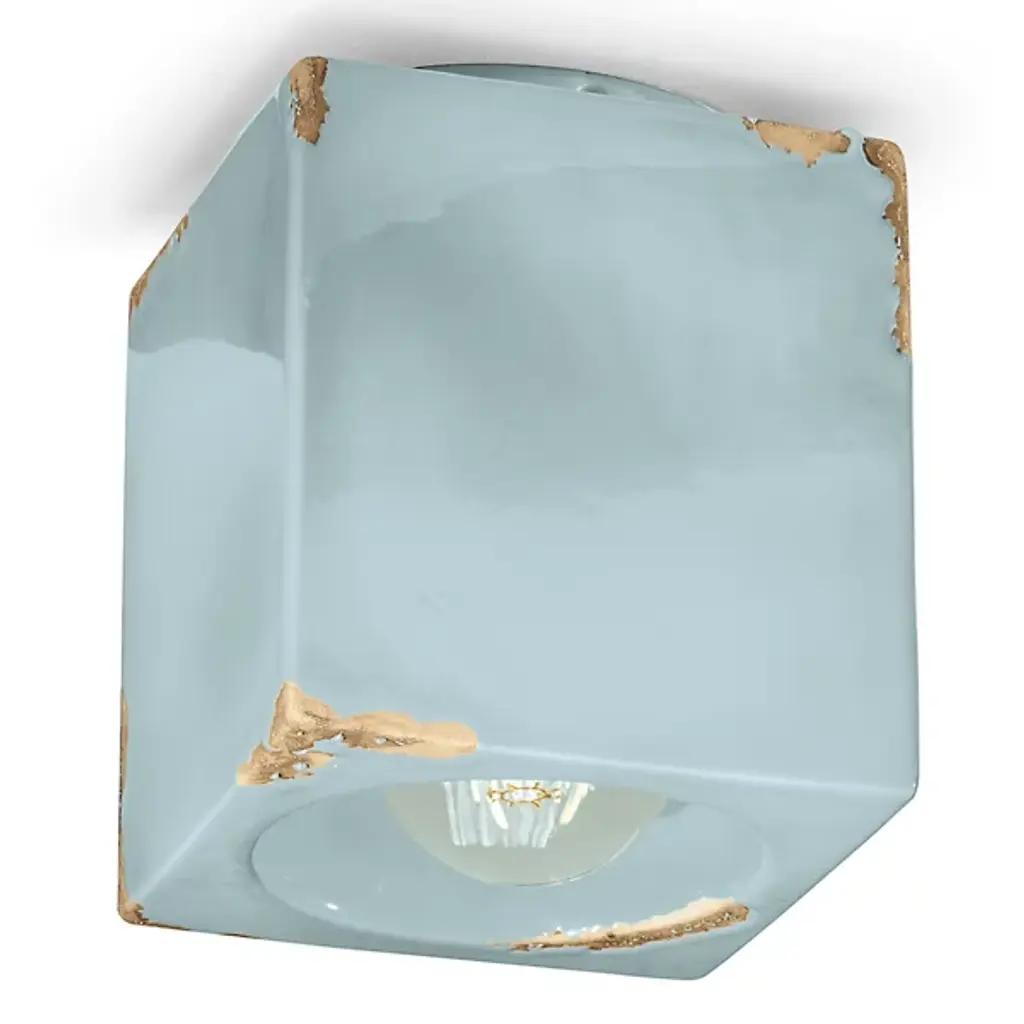 Presented by Ferroluce, the Vintage Flushmount is a charming luminary, drawing the eyes with a boxy silhouette dressed in an alluring glossy finish. Distressed elements add a hint of vintage character, giving the flushmount a lived-in feel. The central aperture reveals an exposed bulb, adding a touch of industrial style, while illumination casts out to provide pleasant animation to the surrounding décor space. Expertly crafted in Italy, the combination of metalwork and ceramic showcases a harmonious fusion of materials and craftsmanship.