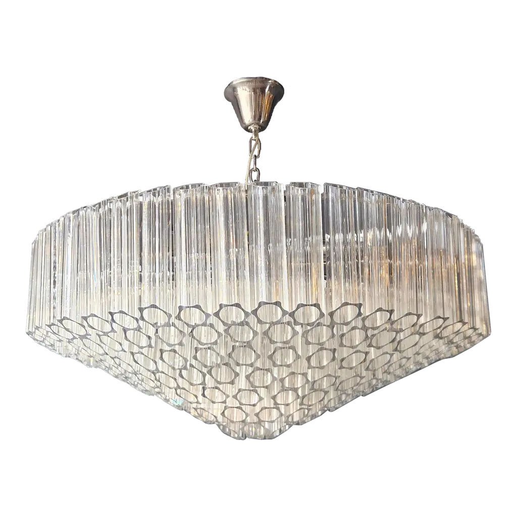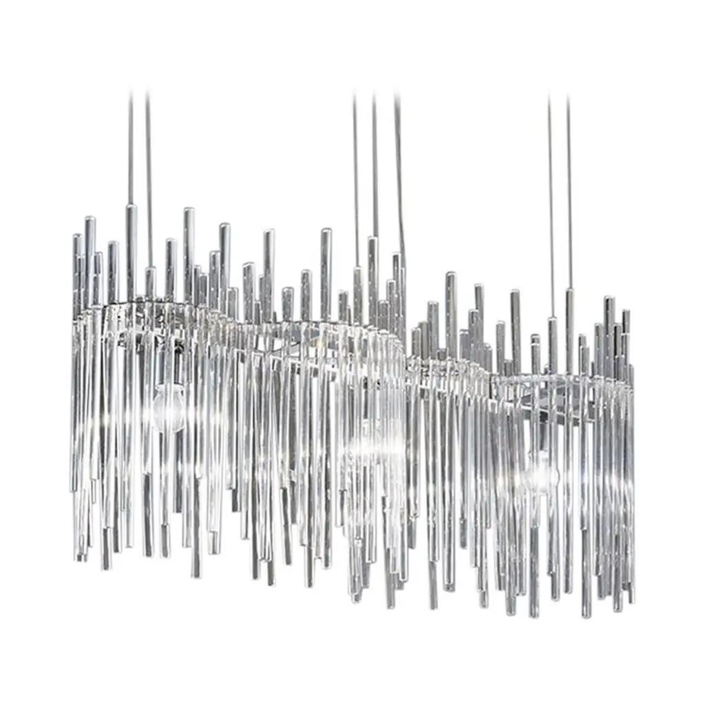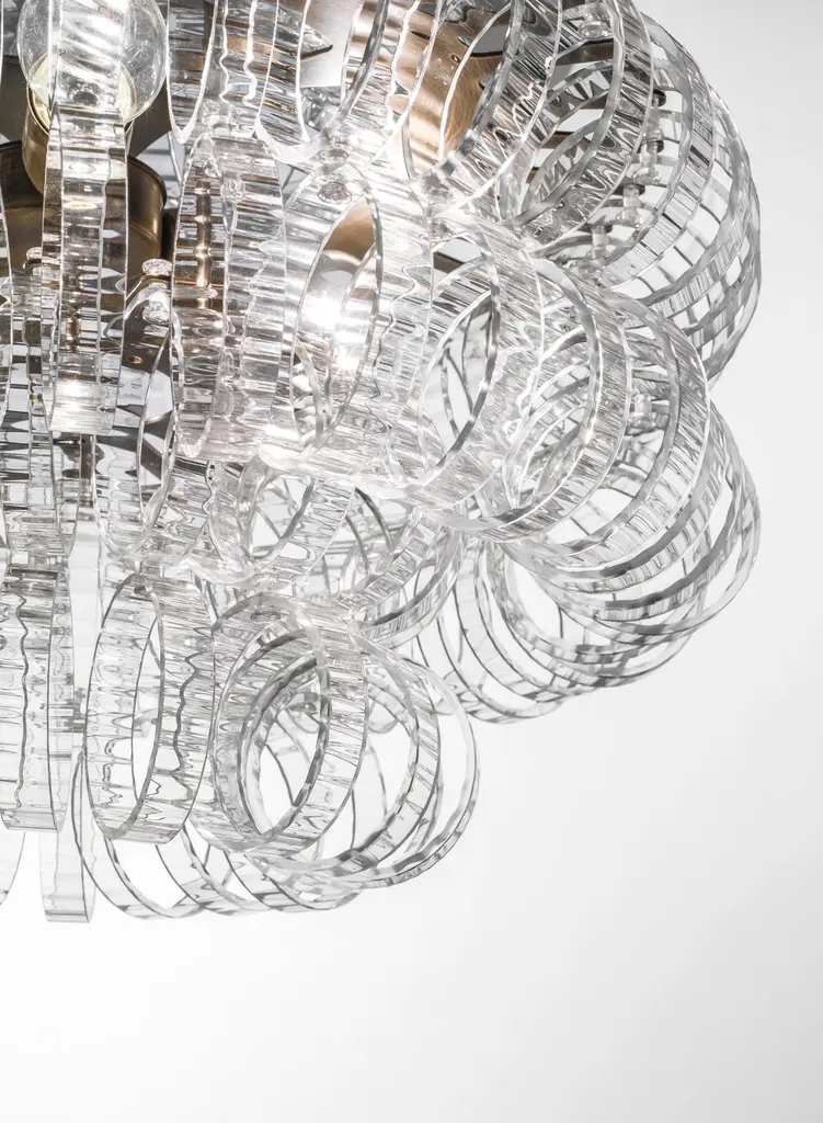 One ring, infinite combinations. The concept of the Ecos collection is just in one element: the glass ring. The chromatic and texture variations that the designers Renato Toso, Noti Massari e Associati have been able to obtain from this simple element are several. That makes the collection extremely customizable in terms of shapes and sizes, for a truly original lighting. Rigadin white or crystal colour glass. Metal parts finishing in satin bronze and chrome.Specifications:Material: Glass, MetalLight source: E26 ULNo of bulbs: 5×60W E26 UL (120V/60HZ)Dimmer: DIM 1Year: 2007Glass finish: Crystal StripedFrame finish: Matt bronze 2Dimensions: Ø 85 x 46 H cmAvailable in other glass finish option: White StripedAvailable in other frame finish option: Glossy chrome Available in other size option: Ø 60 x 35 H cmPlease inquire about customization options.