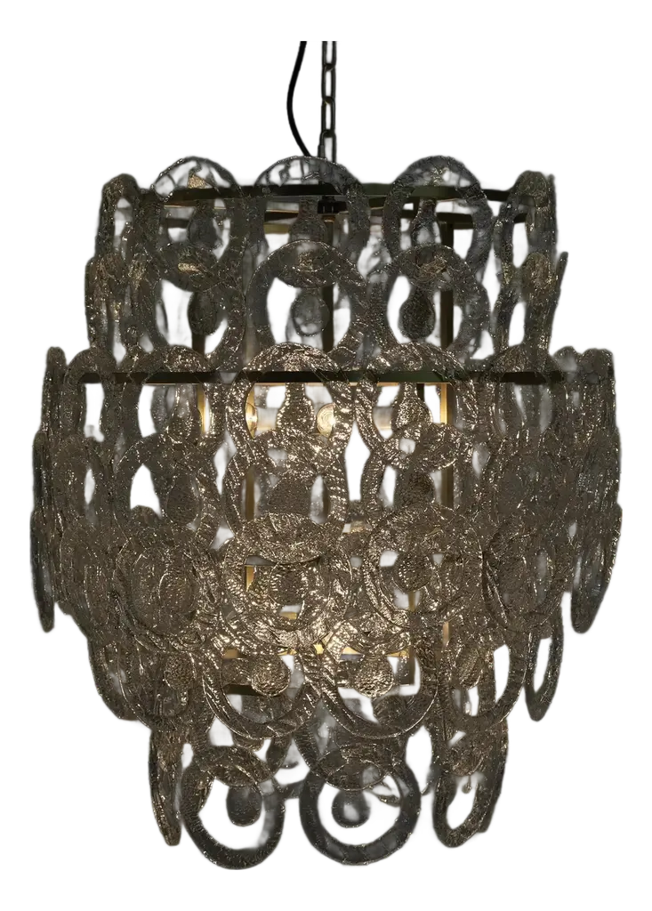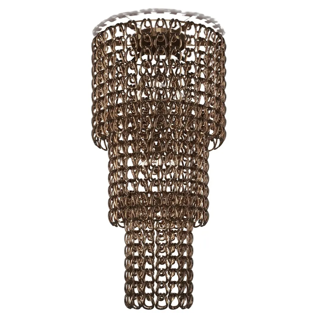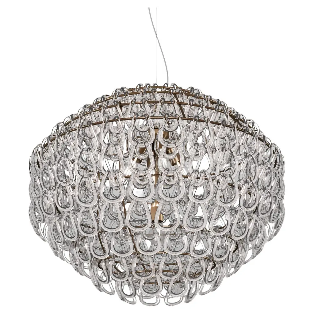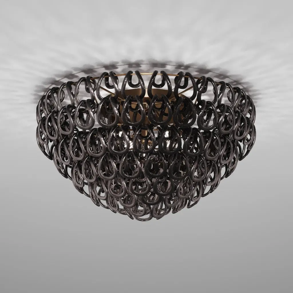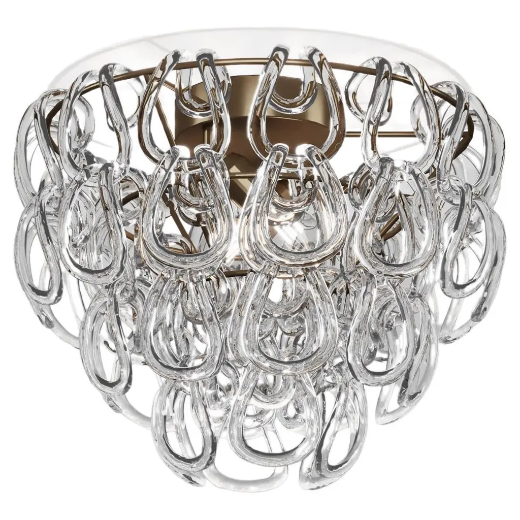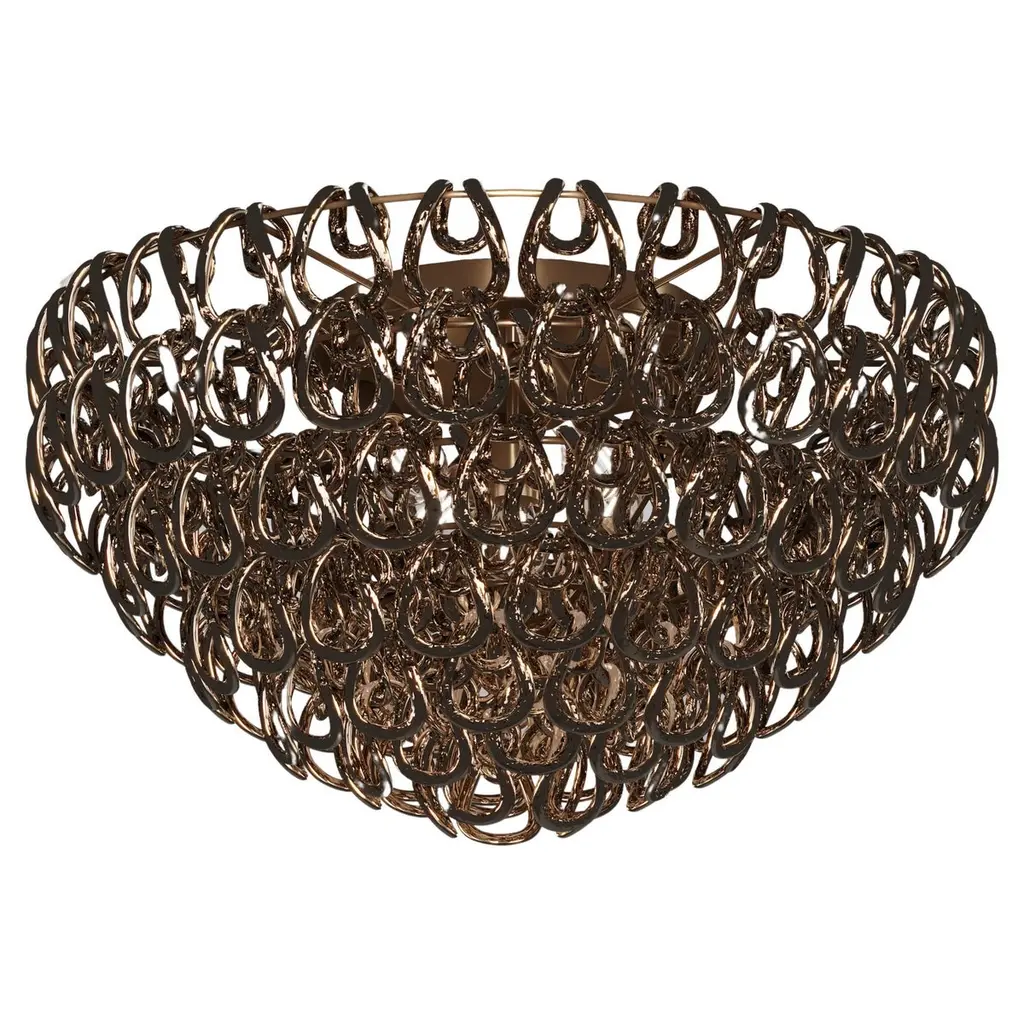 A pure element: the crystal hook. It is the intuition of a master of Italian design, Angelo Mangiarotti, who in 1967 created the best seller of the Vistosi catalogue, Giogali. An iconic interweaving applied to the version one prefers. Specifications:Material: Glass, MetalLight source: E26 UL 1No of bulbs: 5x60W E26 UL 1 (120V/60HZ)Dimmer: DIM 1Year: 1967Glass finish: BlackFrame finish: Matt bronze 1Dimensions: Ø 80 x 42 H cmAvailable in other glass finish options: Crystal Gold, Crystal Transparent, White, Crystal Silver, Crystal Amber, Crystal Bronze, Crystal Smoky, Crystal Black Nickel, Crystal CopperAvailable in other frame finish option: Glossy chrome Available in other size options: Ø 40 x 30, Ø 50 x 35, Ø 60 x 35, 65 x 47, Ø 100 x 350, Ø 100 x 240, Ø 80 x 150 cmPlease inquire about customization options.