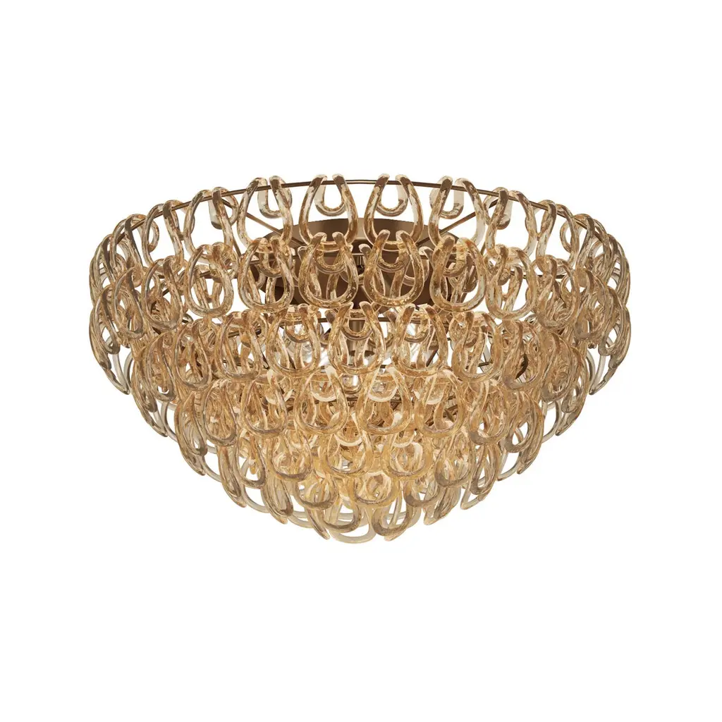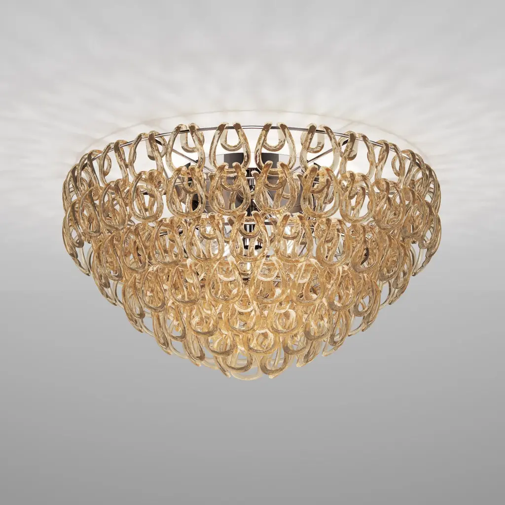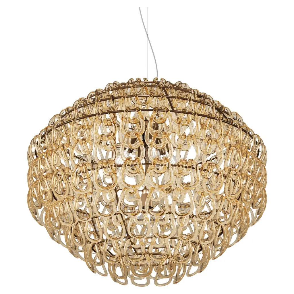 A pure element: the crystal hook. It is the intuition of a master of Italian design, Angelo Mangiarotti, who in 1967 created the best seller of the Vistosi catalogue, Giogali. An iconic interweaving applied to the version one prefers. Specifications:Material: Glass, MetalLight source: E26 UL 1No of bulbs: 5x60W E26 UL 1 (120V/60HZ)Dimmer: DIM 1Year: 1967Glass finish: Crystal AmberFrame finish: Matt bronze 1Dimensions: Ø 80 x 42 H cmAvailable in other glass finish options: Crystal Copper, Black, White, Crystal Silver, Crystal Bronze, Crystal Smoky, Crystal Black Nickel, Crystal Gold, Crystal TransparentAvailable in other frame finish option: Glossy chrome Available in other size options: Ø 40 x 30, Ø 50 x 35, Ø 60 x 35, 65 x 47, Ø 100 x 350, Ø 100 x 240, Ø 80 x 150 cmPlease inquire about customization options.