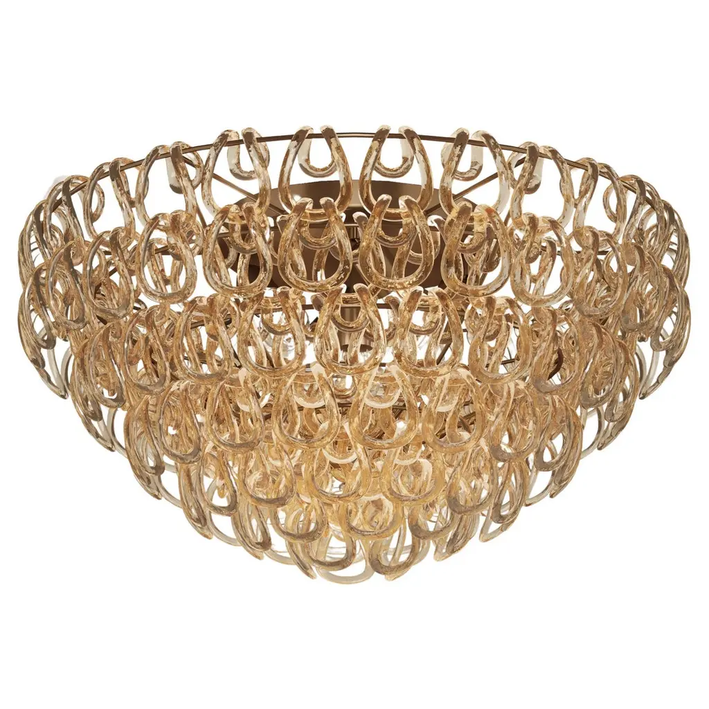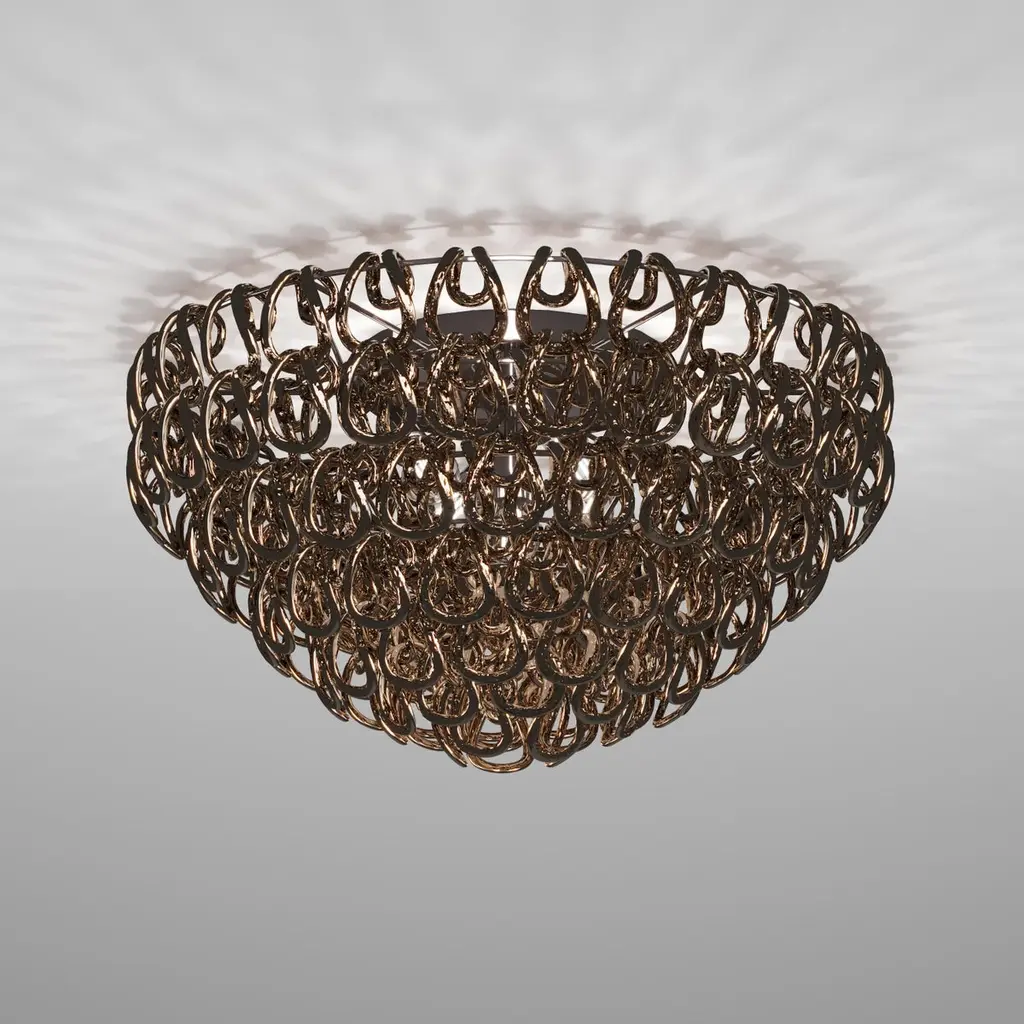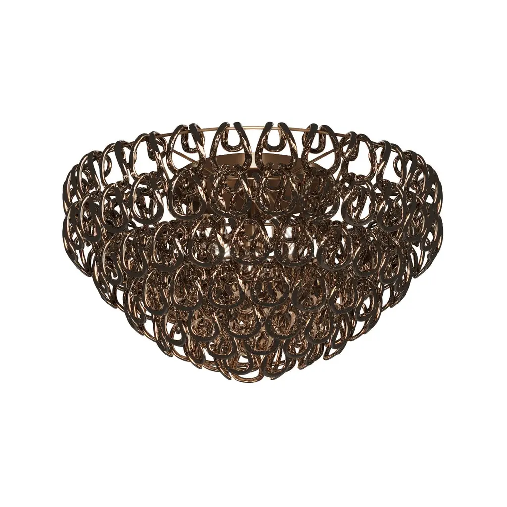 A pure element: the crystal hook. It is the intuition of a master of Italian design, Angelo Mangiarotti, who in 1967 created the best seller of the Vistosi catalogue, Giogali. An iconic interweaving applied to the version one prefers. Specifications:Material: Glass, MetalLight source: E26 UL 1No of bulbs: 5x60W E26 UL 1 (120V/60HZ)Dimmer: DIM 1Year: 1967Glass finish: Crystal BronzeFrame finish: Matt bronze 1Dimensions: Ø 80 x 42 H cmAvailable in other glass finish options: Crystal Copper, Black, White, Crystal Silver, Crystal Amber, Crystal Smoky, Crystal Black Nickel, Crystal Gold, Crystal TransparentAvailable in other frame finish option: Glossy chrome Available in other size options: Ø 40 x 30, Ø 50 x 35, Ø 60 x 35, 65 x 47, Ø 100 x 350, Ø 100 x 240, Ø 80 x 150 cmPlease inquire about customization options.