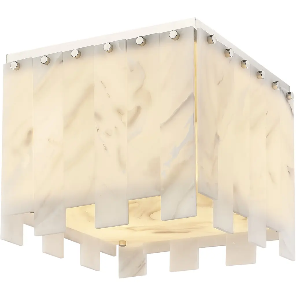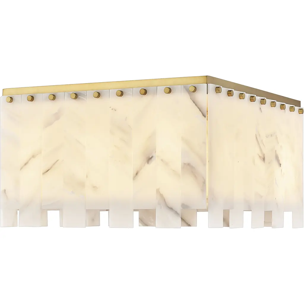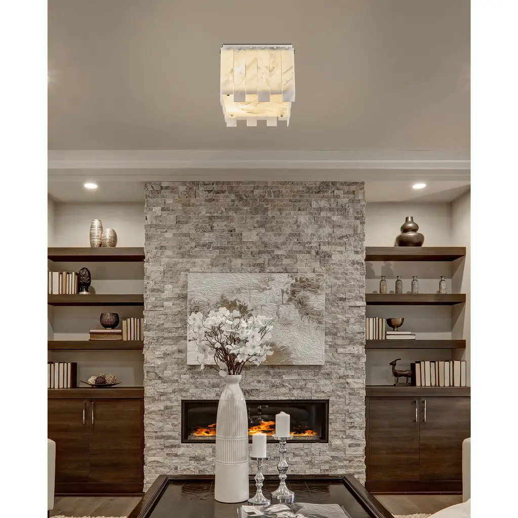 Artistry goes Art Deco in personality and adds an inspired gallery feel with a light fixture that becomes a focal point. This four-light flush mount ceiling light from the Viviana collection creates impact with alabaster-like strips alternating in length and arranged around a square polished nickel finish steel frame. Dressed up with whimsical rivot detailing, this flush mount light goes with the flow as it complements a gritty rendition of toned-down glam in a kitchen or entryway.