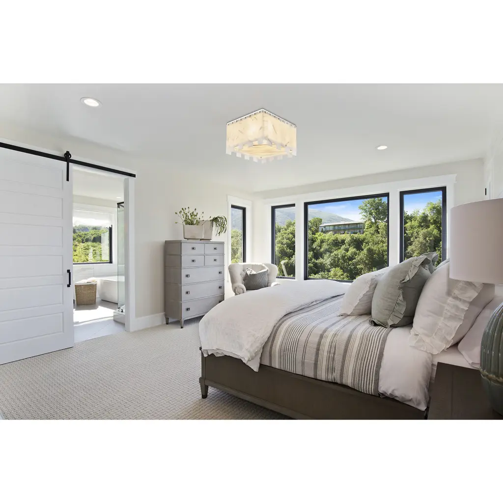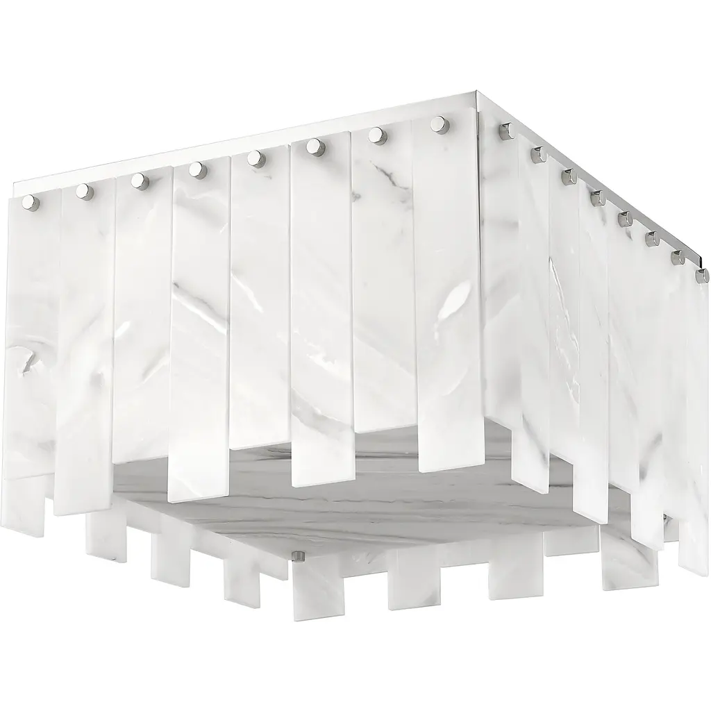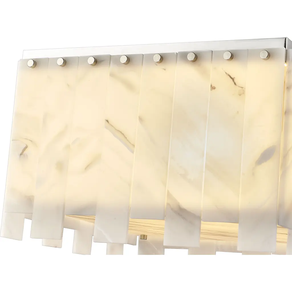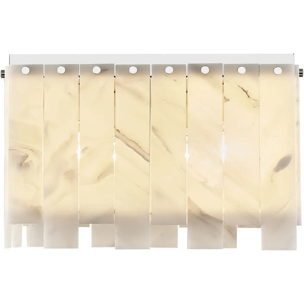 A bit of glam style goes a long way in both lighting and aesthetics. This six-light flush mount ceiling light from the Viviana collection creates impact with alabaster-like strips alternating in length and arranged around a rectangular polished nickel finish steel frame. Dressed up with whimsical rivot detailing, this flush mount light goes with the flow as it complements a gritty rendition of toned-down glam in a kitchen or entryway.