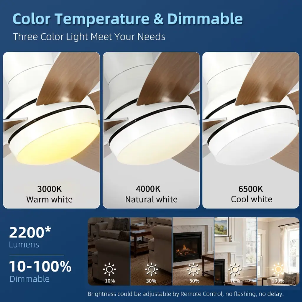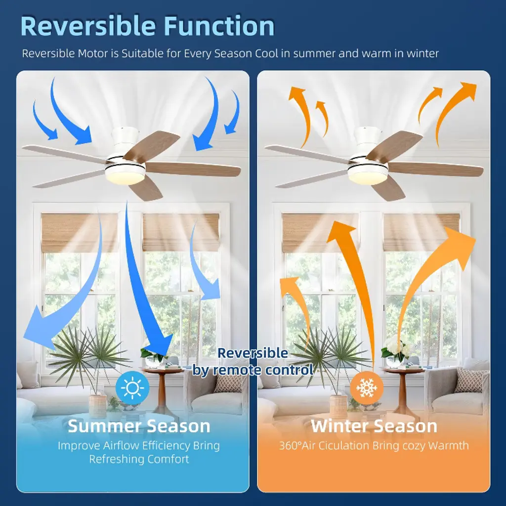 Transform your living space with this 52-inch smart ceiling fan designed for year-round comfort. Its reversible DC motor cools you in summer and circulates warm air in winter. Customize your breeze with six whisper-quiet speeds and adjust the dimmable LED light from bright task lighting to a soft glow, all via remote or app. The dual-sided blades let you match your decor instantly. Built to last and arriving securely packaged, it¡¯s the perfect blend of powerful performance, smart control, and quiet elegance for your home. Enjoy peace of mind with a 1-year warranty.