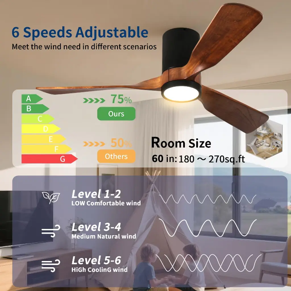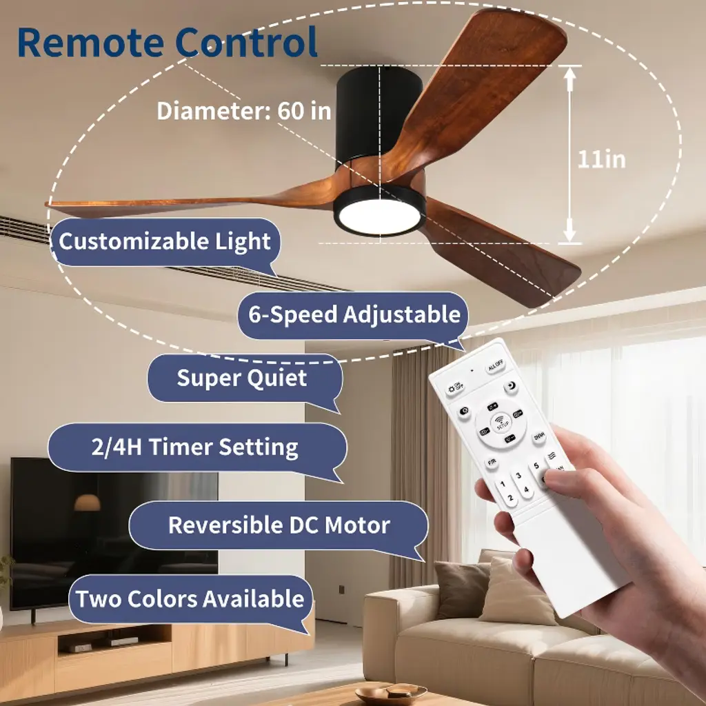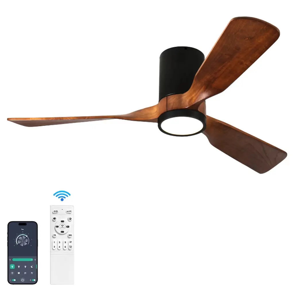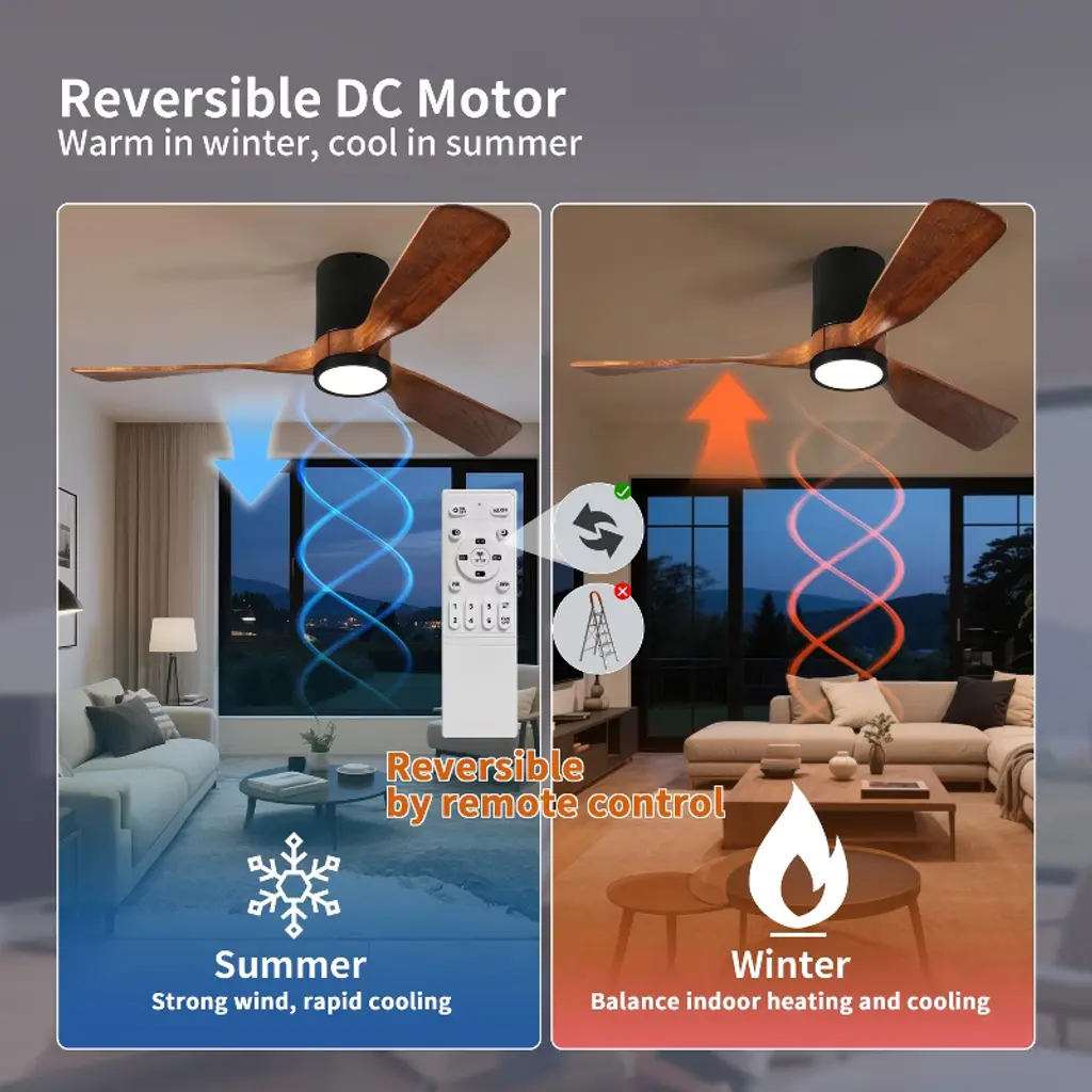 Upgrade your home comfort with our 3-Blade Indoor Ceiling Fan with Remote Control and Light. Featuring quiet DC motor and remote or APP control, easily adjust 6 fan speeds and 3-color dimmable LED lighting. Its reversible function offers cool breezes in summer and warm air circulation in winter. Perfect for bedrooms, living rooms, or covered patios, this energy-efficient fan with solid wood blades delivers style and powerful airflow. Flush mount design fits low ceilings seamlessly. Enjoy year-round comfort and convenience with reliable packaging and a one-year warranty.