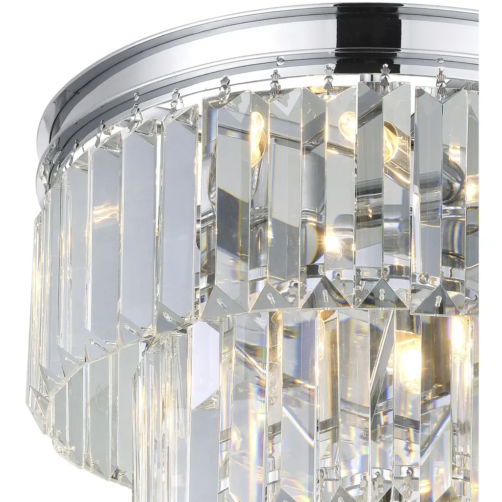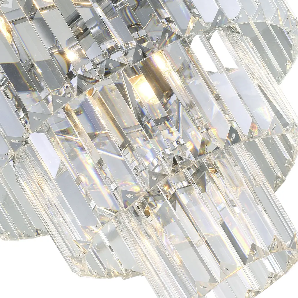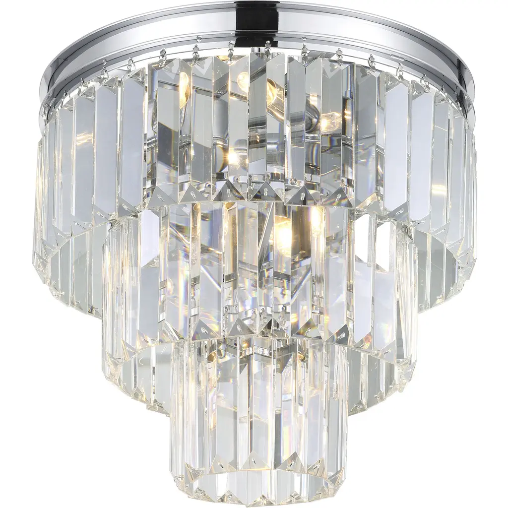 Looking for glam minus the flashy glitz? Then the Weiss 8 Light Flush Mount Chandelier is for you. This lighting fixture is designed with a 12 inch chrome-finished frame holding three tiers of faceted rectangular crystals. This close-to-ceiling lighting option brings in just the right amount of opulence without looking ostentatious and feeling too busy.