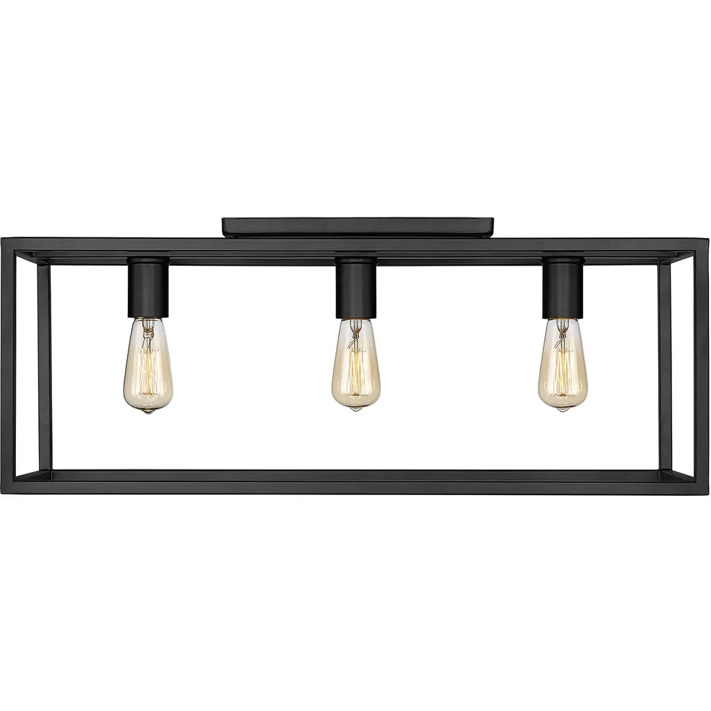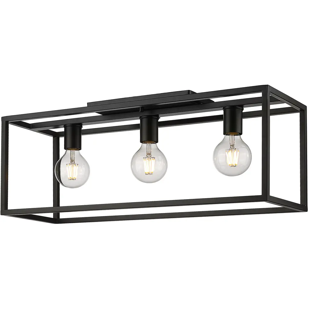 Bring understated elegance into your home with the Golden Lighting Wesson 3-light Flush Mount in Matte Black. Featuring no shade and a deep matte black frame, it creates a refined atmosphere that complements various decors.The robust, open metal cage design showcases exposed bulbs, celebrating the allure of modern industrial style. Our matte black finish features a true non-reflective surface that adds a soft, sophisticated look with a strong graphic quality to your space.Ideal for low ceilings in hallways, closets, laundry areas, and bathrooms, this flush mount is damp location rated and suitable for spaces prone to occasional moisture like covered porches. It requires 3 E26 Medium base bulbs (not included), with a maximum wattage of 100 per bulb.Overall Dimensions: 25.25"W x 9.63"H x 8.25"D. This generous flush mount design creates a substantial focal point while ensuring excellent light distribution and quality craftsmanship.