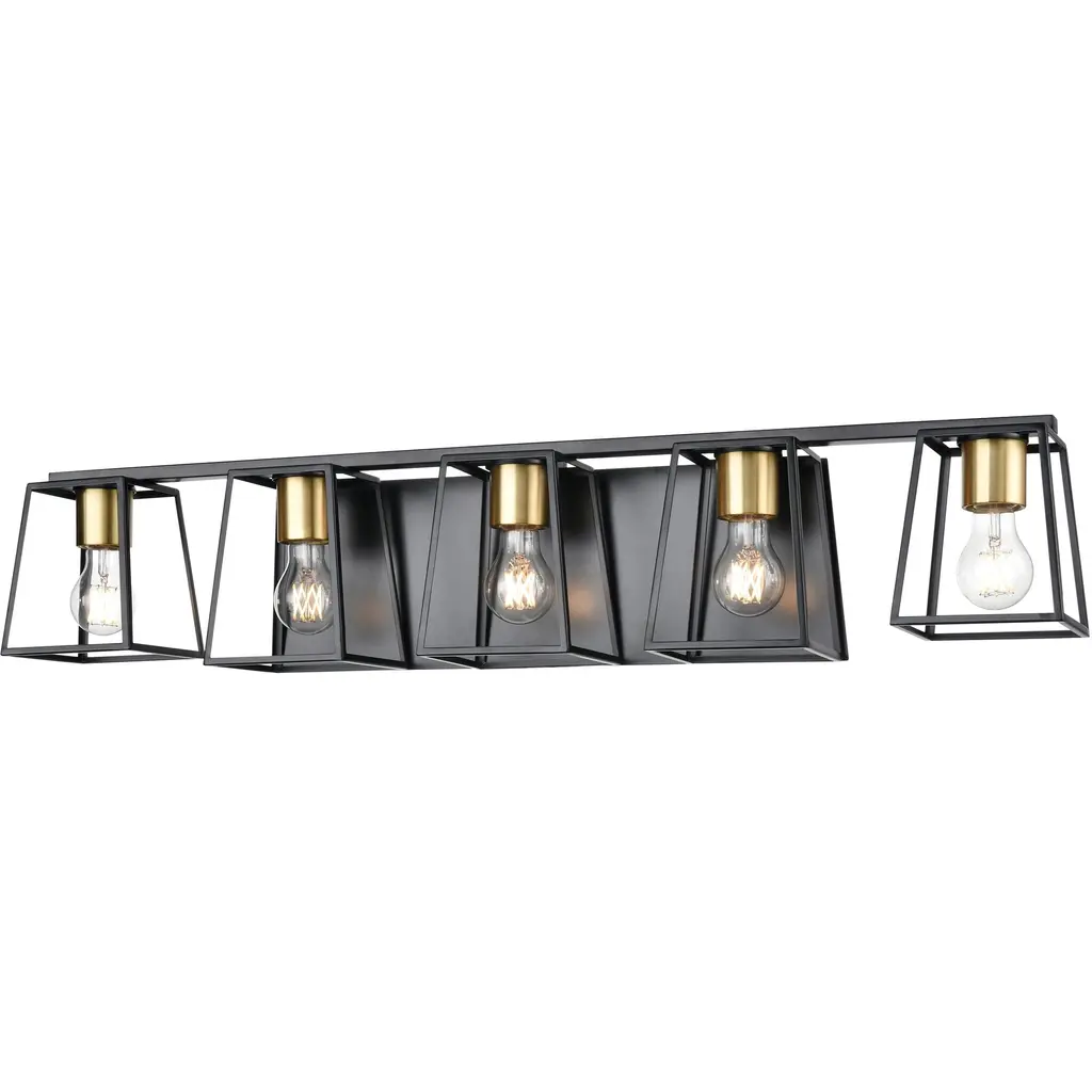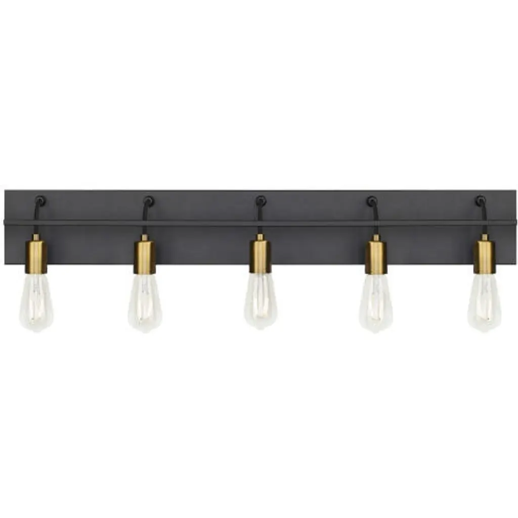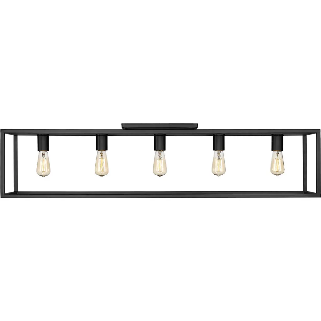 Bring industrial elegance into your home with the Golden Lighting Wesson 5-light Flush Mount. Featuring a robust open design, it creates a welcoming atmosphere in any room.With no shade, this fixture highlights its strong graphic quality and allows for expansive illumination. The bold, utilitarian aesthetic celebrates the charm of open spaces and is perfect for making a statement in low-ceiling areas.The Matte Black finish exemplifies understated elegance and complements various decorsfrom minimalist to contemporary.Ideal for low ceilings in hallways, closets, laundry areas, and bathrooms, this fixture is Damp Location Rated, making it suitable for covered spaces with occasional moisture. It requires 5 E26 Medium base bulbs (not included) with a maximum wattage of 100 per bulb, and the overall dimensions are 41"W x 9.63"H x 8.25"D.Elevate your space with the striking design and quality craftsmanship of the Golden Lighting Wesson. Perfect for those who appreciate a mix of function and vintage-inspired charm.