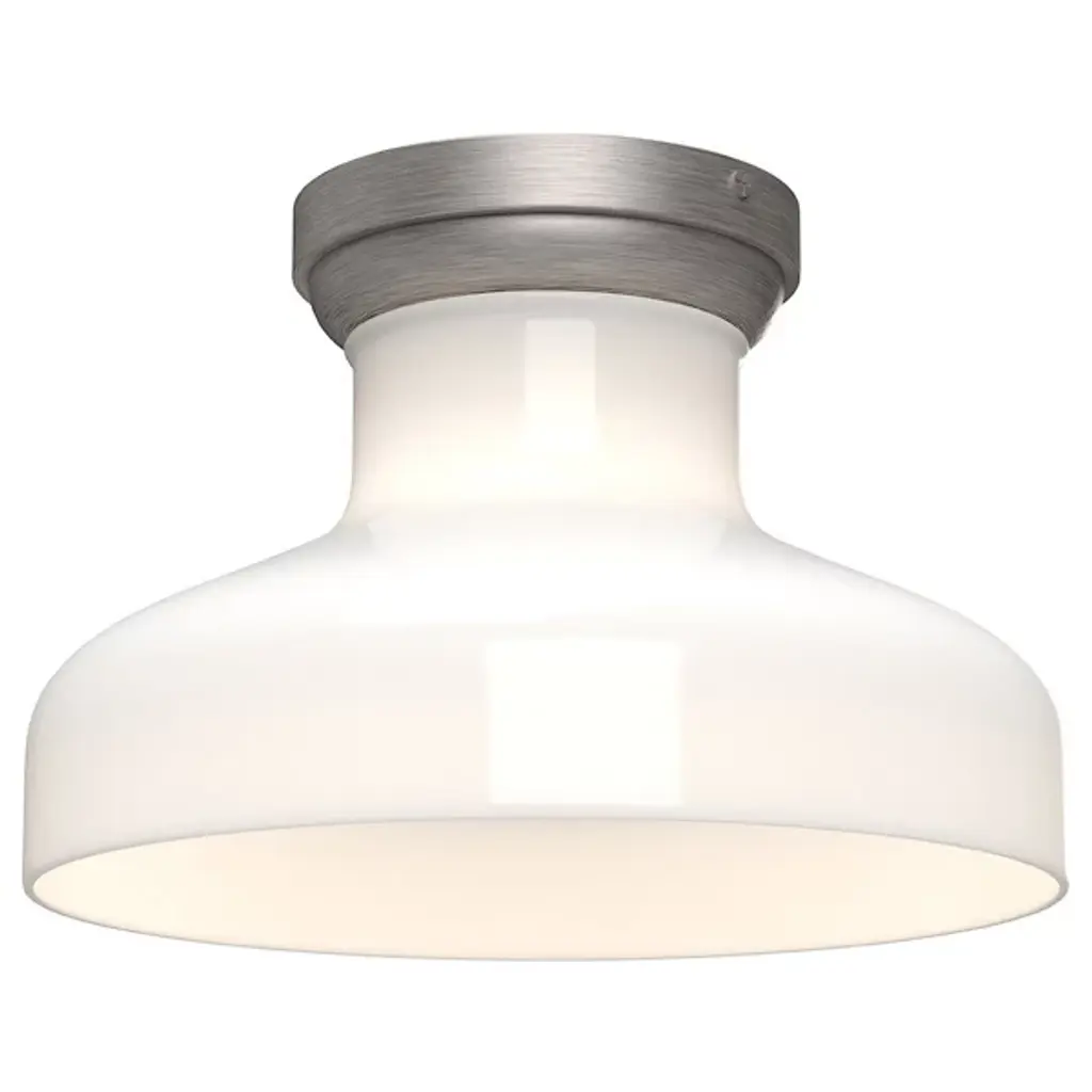 A marvelous modern design with a touch of retro Art Deco. The Westlake Flushmount from Alora Mood reaches down from a contoured circular housing, seating a single strong lamp at its center that blazes out below. A smooth shade of opal glass reaches out around the lamping, flaring out slightly to the sides before curling down and gentling horizontal glare to a friendly glow around a broad pool of downlight.