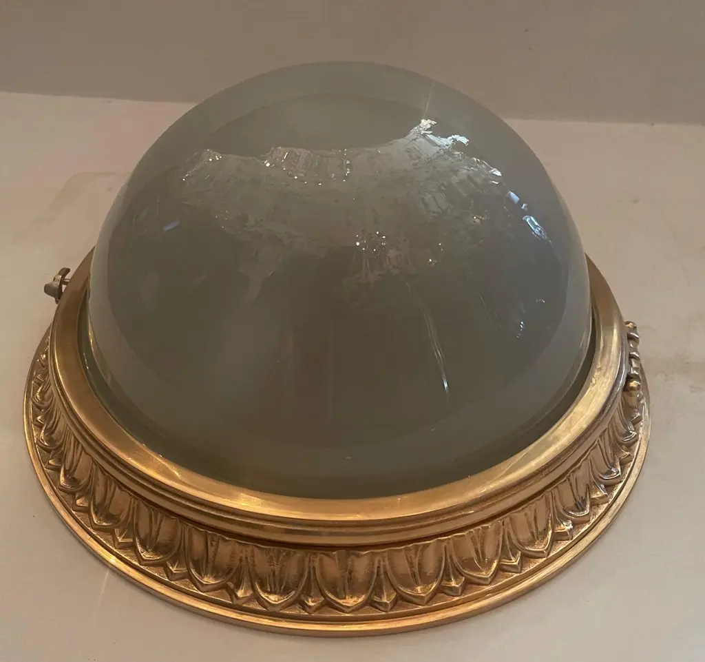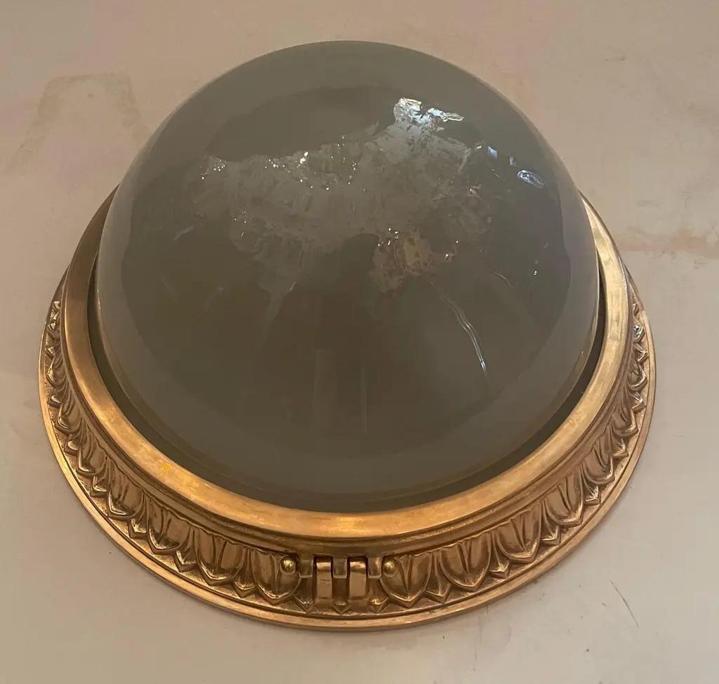 A Wonderful Regency / Neoclassical Bronze With A Frosted Dome Glass Ceiling Flush Mount Light Fixture Having Bin Rewired With Two New Candelabra Sockets, Ready To Install With All Mounting Hardware