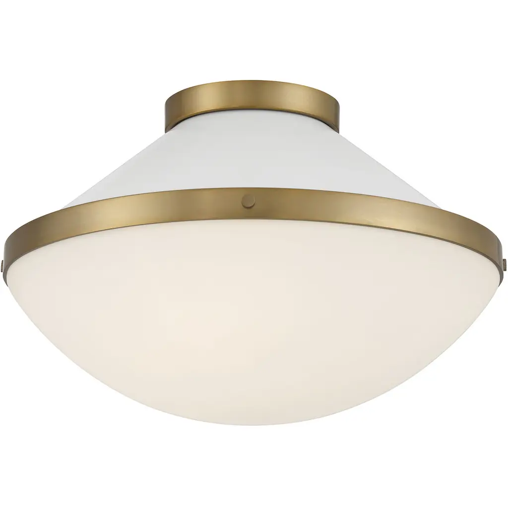 The Xander collection features a playful, mid-century-inspired design with clean lines and fun pops of color. It has white opal glass and gold accents, creating a two-toned finish that adds a touch of whimsy. This versatile fixture can be used in various settings, making it a stylish and functional addition to any room.
