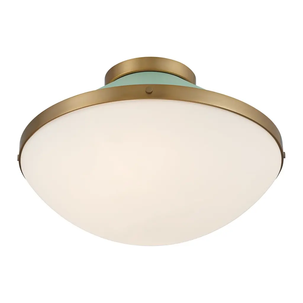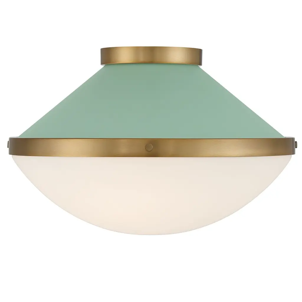 The Xander collection features a playful, mid-century-inspired design with clean lines and fun pops of color. It has white opal glass and gold accents, creating a two-toned finish that adds a touch of whimsy. This versatile fixture can be used in various settings, making it a stylish and functional addition to any room.