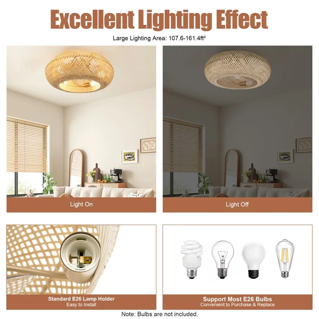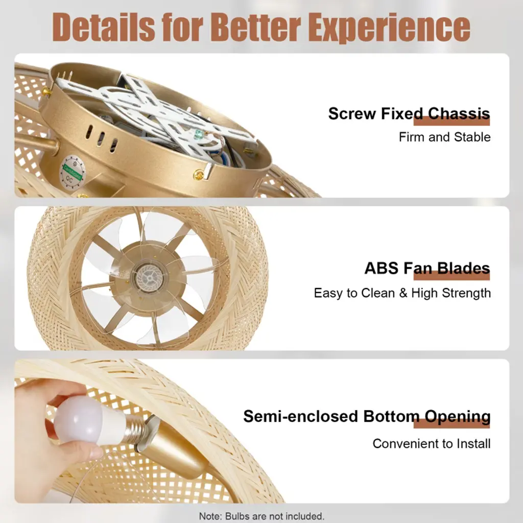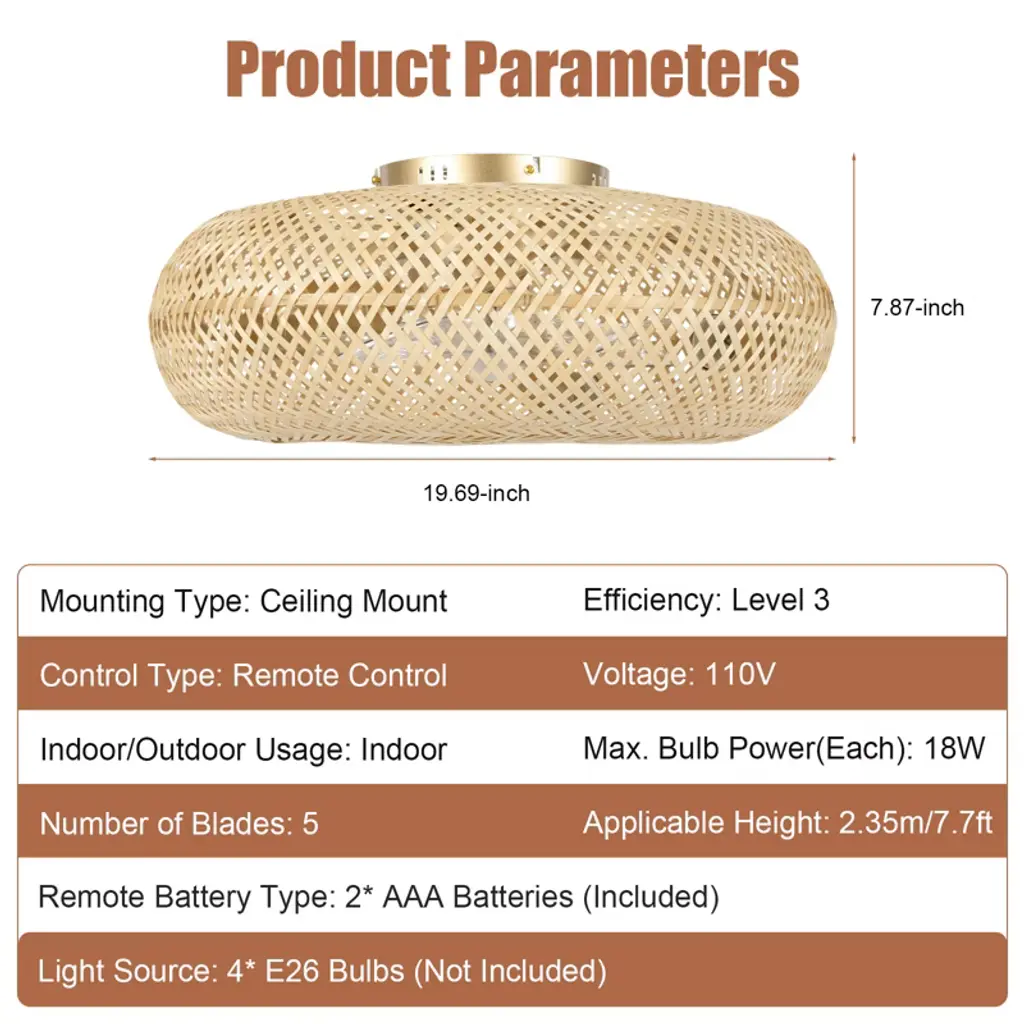 This ceiling fan mainly uses woven rattan and iron material with exquisite processes, making it anti-rust and sturdy. Its woven rattan shade in a cage shape looks classical and rustic in your farmhouse, living room, porch, patio, etc. within 107.6-161.4ft². You can achieve simple operation with the remote control to adjust the speed, reversible function, and timing function. Choose this ceiling fan, you can have a comfortable life. Specifications Color: Gold, Rattan Yellow Material: Woven Rattan, Iron Blades Material: ABS Process: Hand-woven, Spray-painted Style: Classical, Farmhouse Shape: Round, Cage Mounting Type: Ceiling Mount Control Type: Remote Control Recommended Uses for Product: Air Circulation Indoor/Outdoor Usage: Indoor Number of Rotor Blades: 5 Fan Speed: 6 Gears Timing Function: 1/2/4/8H Reversal Function: Yes Battery Type: 2* AAA 1.5V Batteries (Included) Light Source: 4* E26 Bulbs (Not Included) Efficiency: Level 3 Voltage: 110V Max. Bulb Power: 18W Bulbs Length: Less than 125mm/4.92 inches Applicable Height: 2.35m/7.7ft Applicable Area: 10-15m²/107.6-161.4ft² Chassis Diameter: 17.5cm/6.89inch Ceiling Fan Light Height: 20cm/7.87inch Ceiling Fan Light Diameter: 50cm/20inch Package Included 1* Ceiling Fan Light 1* Remote Control 2* Batteries 1 Bag* Screws and Nuts 1* English Manual