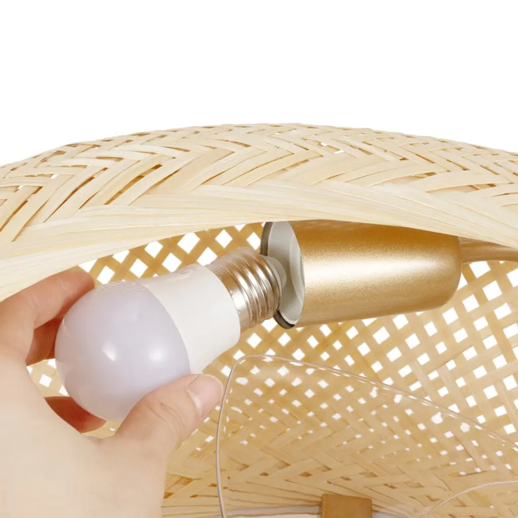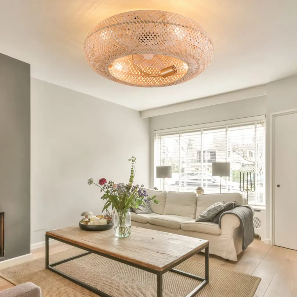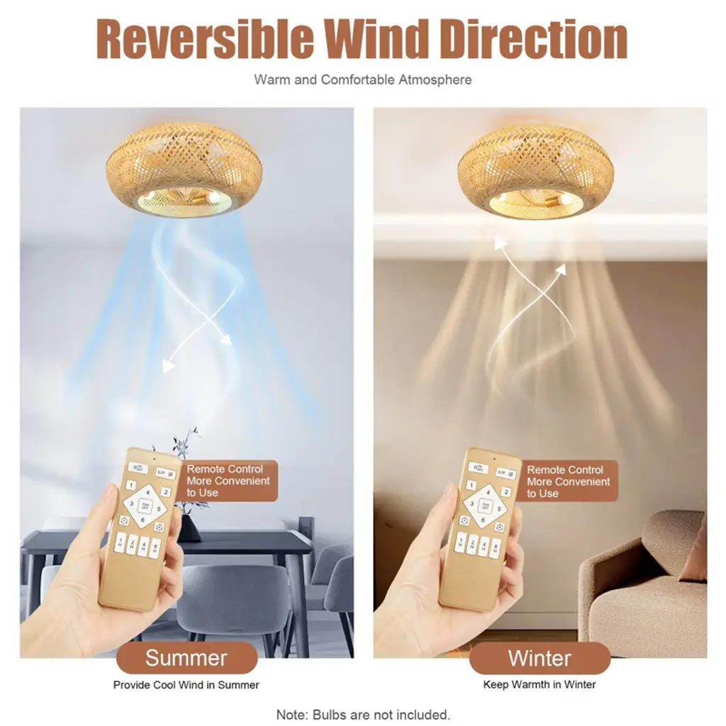 This ceiling fan mainly uses woven rattan and iron material with exquisite processes, making it anti-rust and sturdy. Its woven rattan shade in a cage shape looks classical and rustic in your farmhouse, living room, porch, patio, etc. within 107.6-161.4ft². You can achieve simple operation with the remote control to adjust the speed, reversible function, and timing function. Choose this ceiling fan, you can have a comfortable life. Specifications Color: Gold, Rattan Yellow Material: Woven Rattan, Iron Blades Material: ABS Process: Hand-woven, Spray-painted Style: Classical, Farmhouse Shape: Round, Cage Mounting Type: Ceiling Mount Control Type: Remote Control Recommended Uses for Product: Air Circulation Indoor/Outdoor Usage: Indoor Number of Rotor Blades: 5 Fan Speed: 6 Gears Timing Function: 1/2/4/8H Reversal Function: Yes Battery Type: 2* AAA 1.5V Batteries (Included) Light Source: 4* E26 Bulbs (Not Included) Efficiency: Level 3 Voltage: 110V Max. Bulb Power: 18W Bulbs Length: Less than 125mm/4.92 inches Applicable Height: 2.35m/7.7ft Applicable Area: 10-15m²/107.6-161.4ft² Chassis Diameter: 17.5cm/6.89inch Ceiling Fan Light Height: 20cm/7.87inch Ceiling Fan Light Diameter: 50cm/20inch Package Included 1* Ceiling Fan Light 1* Remote Control 2* Batteries 1 Bag* Screws and Nuts 1* English Manual