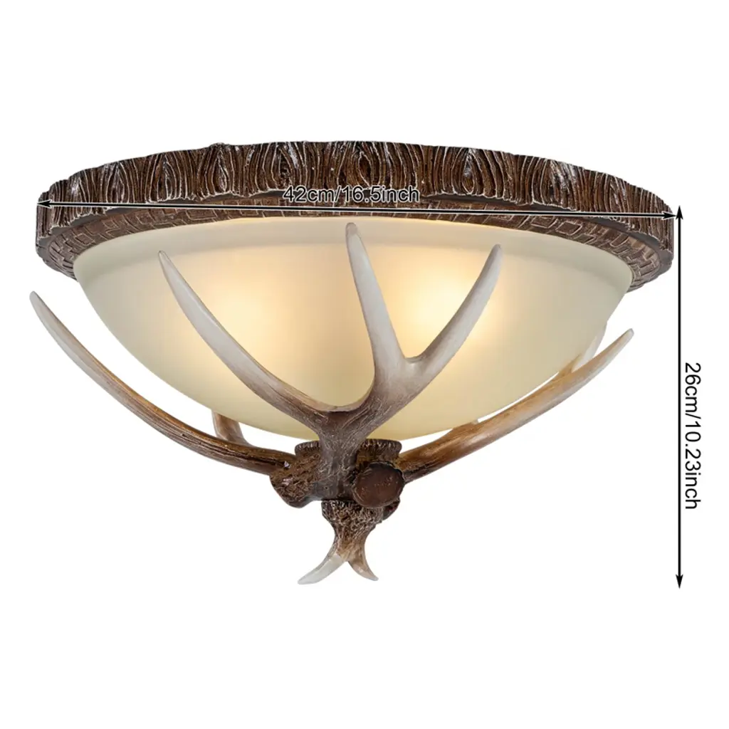 This handcrafted antler resin ceiling light brings a warm vintage charm to any space with its unique winding antler design and antique beige-brown finish. Made from durable resin, iron, and glass with a baked paint surface, it offers long-lasting use while resisting corrosion and scratches. The fixture accommodates 3 E26 bulbs (not included), providing soft, eye-friendly illumination for areas up to 107.6 ft². Its stable round base and blunted antler edges ensure safe and easy installation, while the versatile style complements living rooms, dining areas, bedrooms, and more. A perfect blend of artistry and function, this ceiling light also makes an ideal gift for housewarmings, birthdays, or holidays. Specifications Style: Vintage Voltage: 110V Shape: Circular Color: Antique Colors Efficiency: E Craft: Handcrafted Antique Material: Resin, Iron and Glass Surface Treatment: Baking Paint Installation Method: Surface Mounted Indoor/Outdoor Usage: Indoor Assembly Required: Yes Mount Type: Ceiling Mount Single Bulb Power: 40-60W Lighting Range: Universal 5㎡ -10㎡/ 53.8ft²-107.6ft² Light Source: 3* E26 Bulbs (Not Included) Product Size(D*H): 42*26cm / 16.5*10.23in
