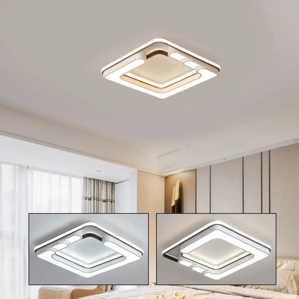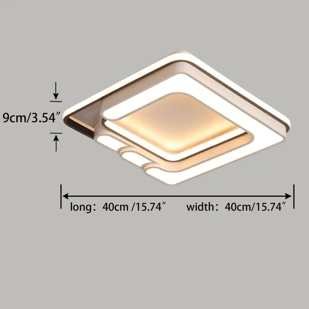 Experience the perfect blend of modern elegance and superior functionality with our exquisite ceiling light. Meticulously crafted from premium materials, its unique linear design and durable construction are built to last, adding a touch of luxury to any space. Enjoy brilliant, eye-safe lighting that is fully customizable with a remote control, creating the ideal ambiance for your home with effortless style and convenience. Details Sturdy Base: The sturdy base increases stress area, thus making the ceiling light fixed firmly without falling easily. Closed Shade: It effectively prevents impurities, etc. from entering and its high light transmission provides good lighting for your house. Specifications Color: White Shape: Square Power Source: Wired Style: Modern Control Type: Wall Switch and Remote Control Mounting Type: Ceiling Mount Installation: Yes Indoor/Outdoor Usage: Indoor Use Only Efficiency: E Product Size: 40*40*9cm/15.74*15.74*3.54in