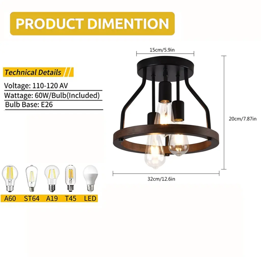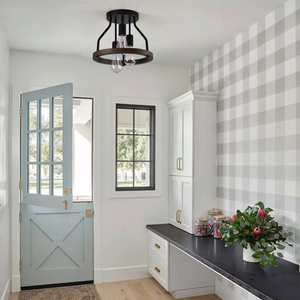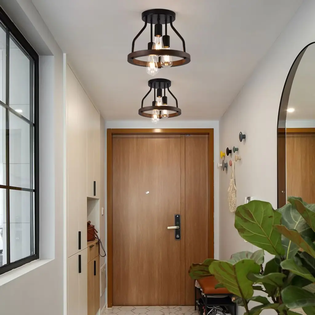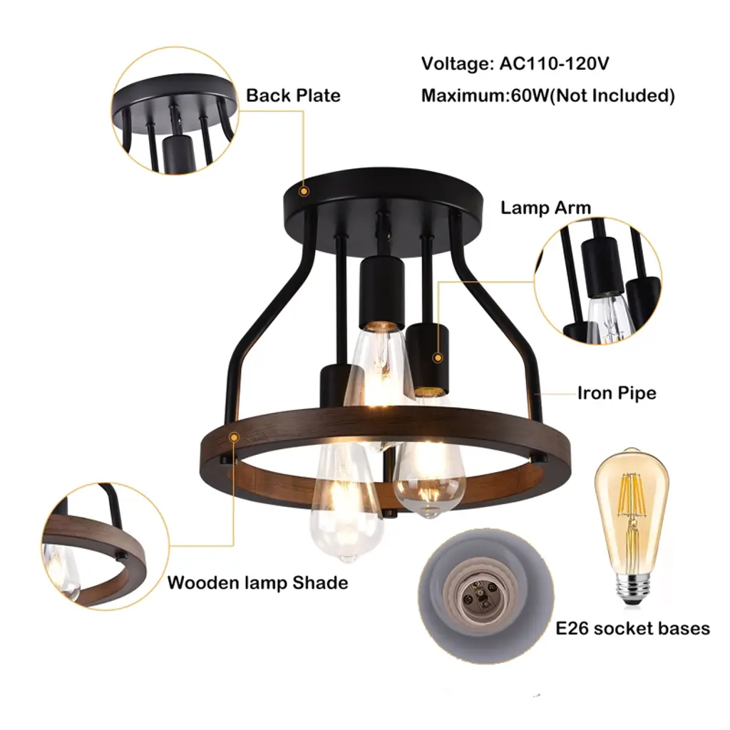 Yiyibyus Wooden 3-light Vintage Matte Black Flush Mount Ceiling Lamp