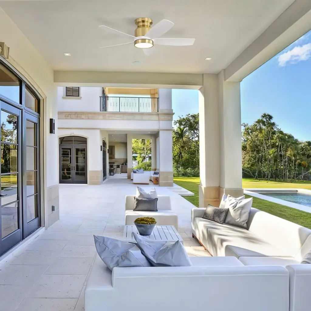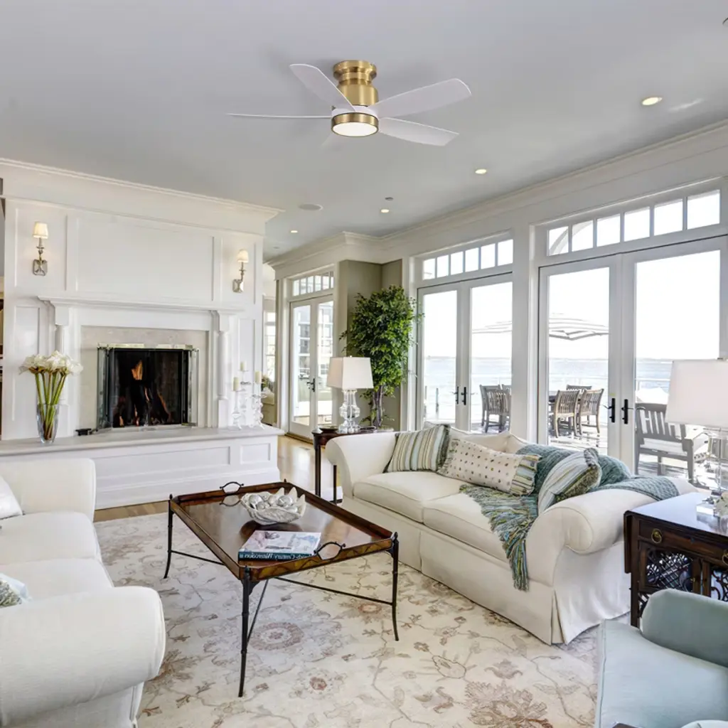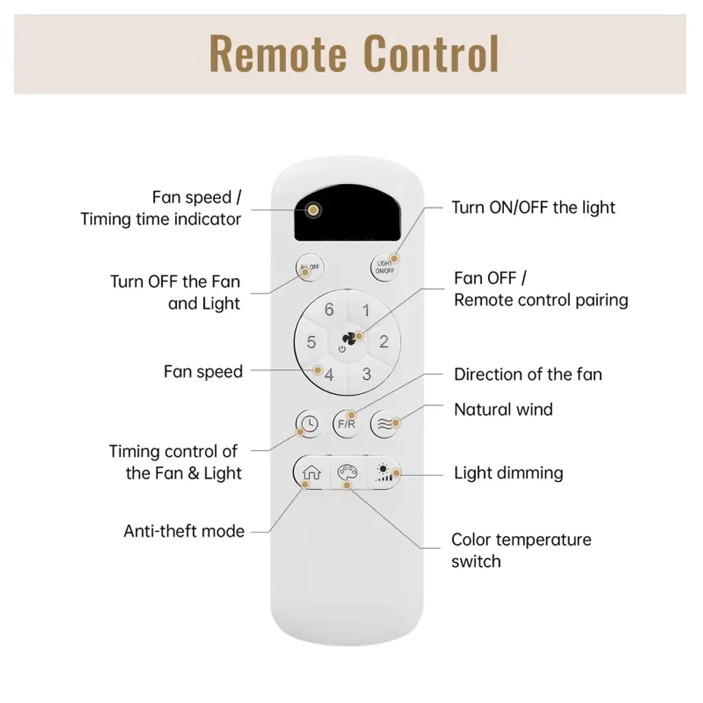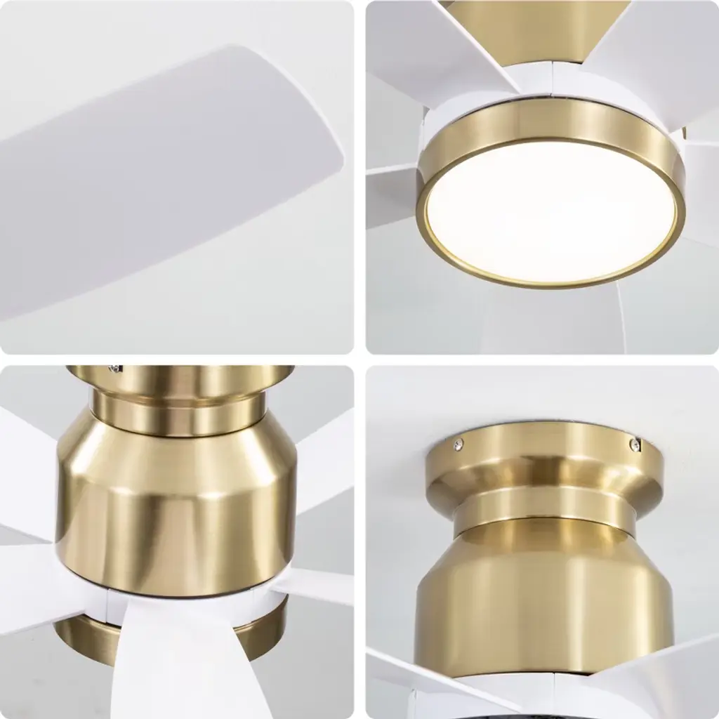 42 Inch Ceiling Fan with Light Color: White Blades/ Gold Body Blade Material: ABS Blades Size: 42" Power Source: Reversible Dc Motor Voltage: 100-240V/50~60Hz Light Source: 3CCT LED 22W Controller Type: Remote Control Special Feature: Timer, Flush mount design Certification: ETL Room Type: Farmhouse, Restaurant, Rustic, Garage, Living Room, Bedroom, Home Office, Kids Room, Balcony, Cabinet, Garage, Garden, Home, Shop, Dining Room High Quality Ceiling Fan This ceiling fan features a high-capacity DC motor, delivering powerful airflow and ensuring years of quiet performance. With its durable and modern design, this 42-inch ceiling fan is perfect for small to medium-sized rooms from 80-160 sq.ft. Reversible Ceiling Fan Reversible DC Motor Quiet Energy saving, Function Includes Forward and Reverse for Summer and Winter 2 Airflow Modes, Cooling In Summer and Keeping Warm in Winter. Modern 42 Inch Ceiling Fan This modern ceiling fan with light, each piece is carefully designed and crafted with great quality ABS blades. It gives the indoor/ outdoor decor a touch of luxury and refinement.