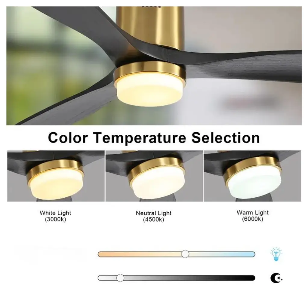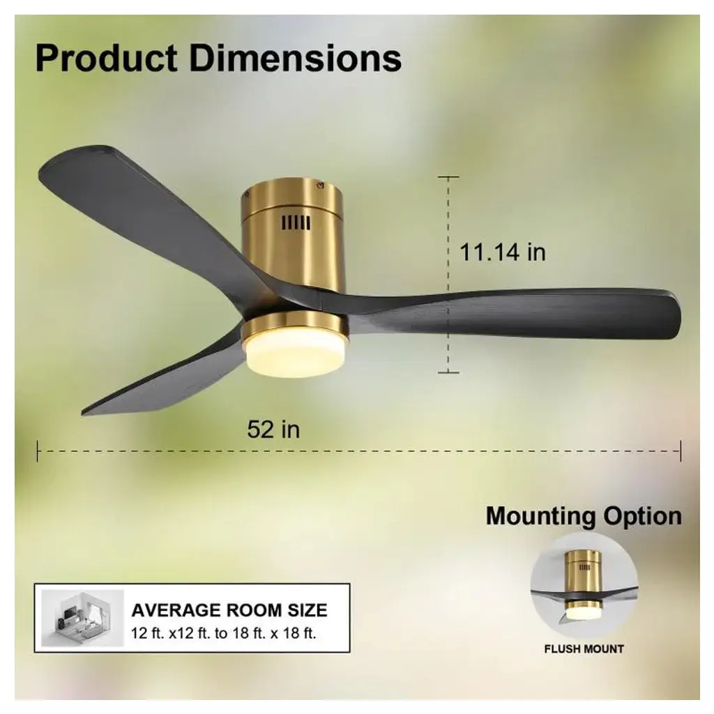 Minimalist Solid Wood Ceiling Fan 52-inch modern wood ceiling fan is simply and beautifully designed to complement any room decor, perfect for those who want to add a touch of sophistication and elegance to their home or outdoor space, suitable for patio, gazebo, living room, bedroom various places. Also features high-quality solid wood leaves that are both durable and long-lasting. Reversible Ceiling Fan The flush mount ceiling fan can be forward and reversible, and perfectly circulates the air, keeping it nice and comfortable, so it can be available for four seasons. High Quality Ceiling Fan This ceiling fan is made of high-quality solid wood and stainless steel, which is strong and durable. The fan motor adopts a pure copper motor, which has the characteristics of strong power and low noise. Advanced Saving 3CCT LED Light The ceiling fan adopts an 18W LED light source with a lighting memory function. Compared with ordinary light sources, LED light sources are more energy-efficient and have a longer lifespan. There are 3 color temperatures to choose from (3000K/4500K/6000K).