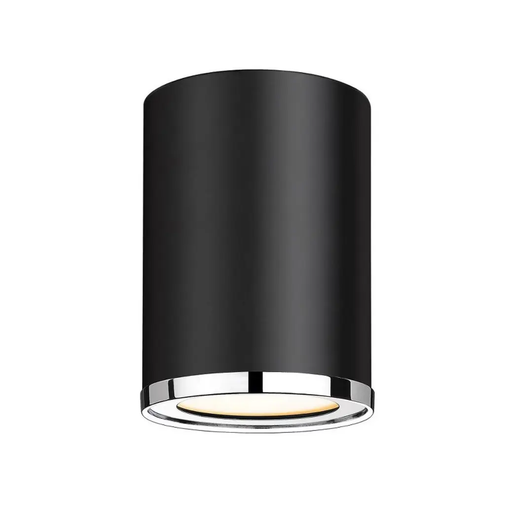 Bold and modern defines this flush mount, which features a two toned metal shade and stepped diffuser. Its bold but understated style makes this a versatile modern ceiling light fixture for any room in your home. Room Recommendation: Bedroom/Dining Room/Foyer/Hallway/Kids Room/Kitchen/Living Room/Office/Utility Room Shade Included: Yes Dimmable: Yes Material: Steel, Finish Color: Matte Black/Rubbed Brass, Width: 5.25", Height: 7.5", Length: 5.25", Hanging Method: Flush, Lamping Type: Incandescent, Number Of Bulbs: 1, Wattage: 60 Watts, Dimmable: Yes, Moisture Rating: Damp Rated