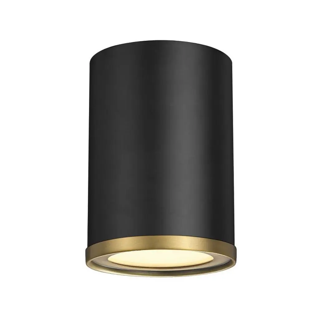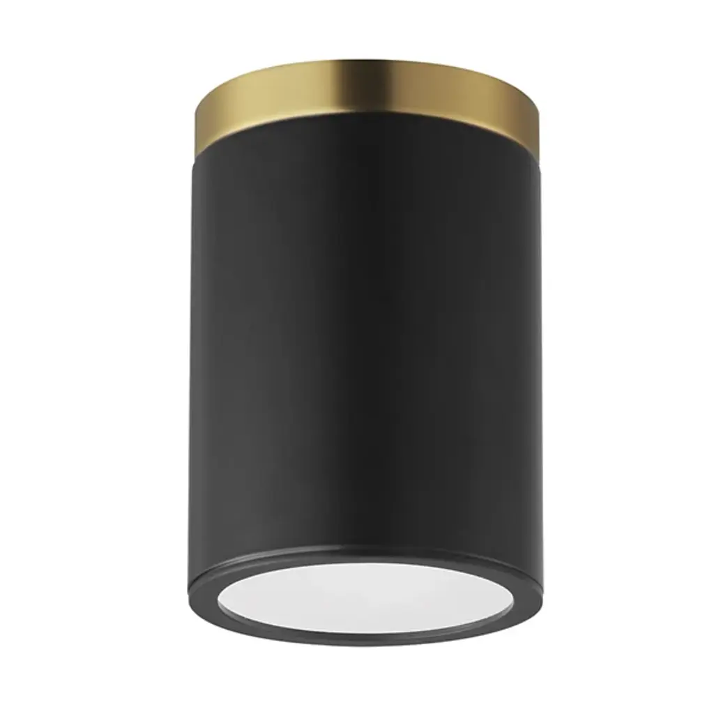 Bold and modern defines this flush mount, which features a two toned metal shade and stepped diffuser. Its bold but understated style makes this a versatile modern ceiling light fixture for any room in your home. Room Recommendation: Bedroom/Dining Room/Foyer/Hallway/Kids Room/Kitchen/Living Room/Office/Utility Room Shade Included: Yes Dimmable: Yes Material: Steel, Finish Color: Matte White/Rubbed Brass, Width: 5.25", Height: 7.5", Length: 5.25", Hanging Method: Flush, Lamping Type: Incandescent, Number Of Bulbs: 1, Wattage: 60 Watts, Dimmable: Yes, Moisture Rating: Damp Rated