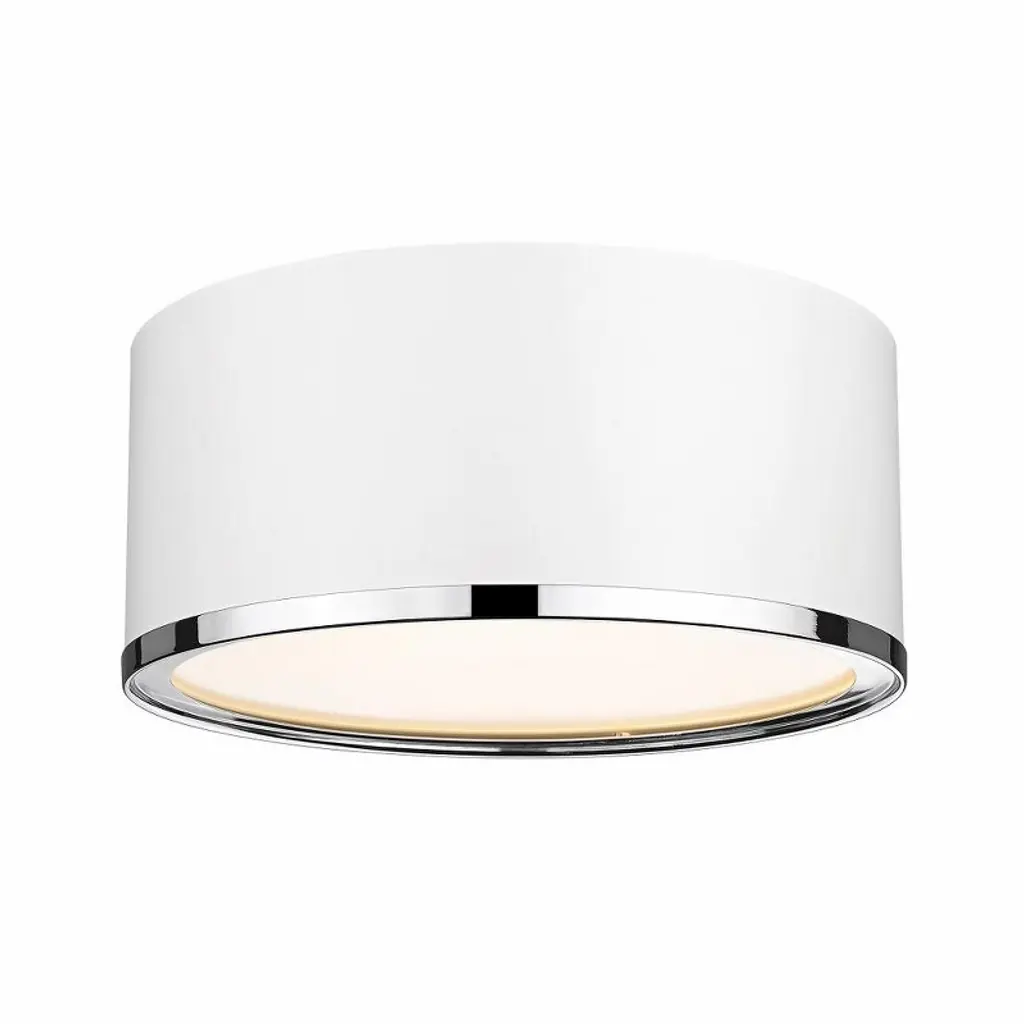 Bold and modern defines this flush mount, which features a two toned metal shade and stepped diffuser. Its bold but understated style makes this a versatile modern ceiling light fixture for any room in your home. Room Recommendation: Bedroom/Dining Room/Foyer/Hallway/Kids Room/Kitchen/Living Room/Office/Utility Room Shade Included: Yes Dimmable: Yes Material: Steel, Finish Color: Matte White/Chrome, Width: 16", Height: 6", Length: 16", Hanging Method: Flush, Lamping Type: Incandescent, Number Of Bulbs: 3, Wattage: 60 Watts, Dimmable: Yes, Moisture Rating: Damp Rated