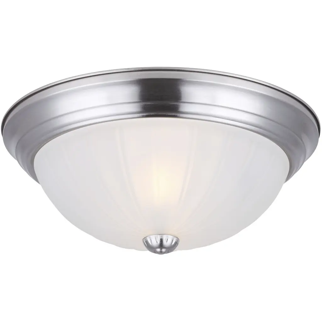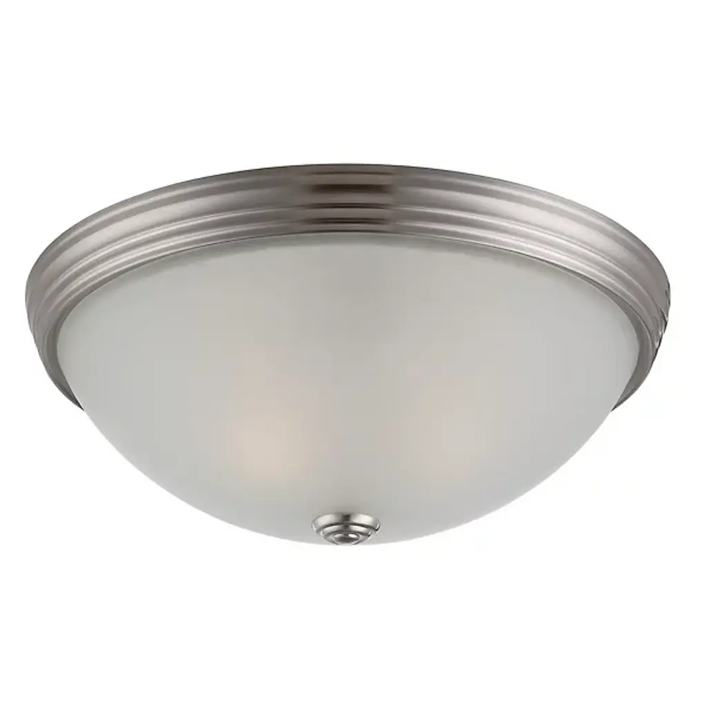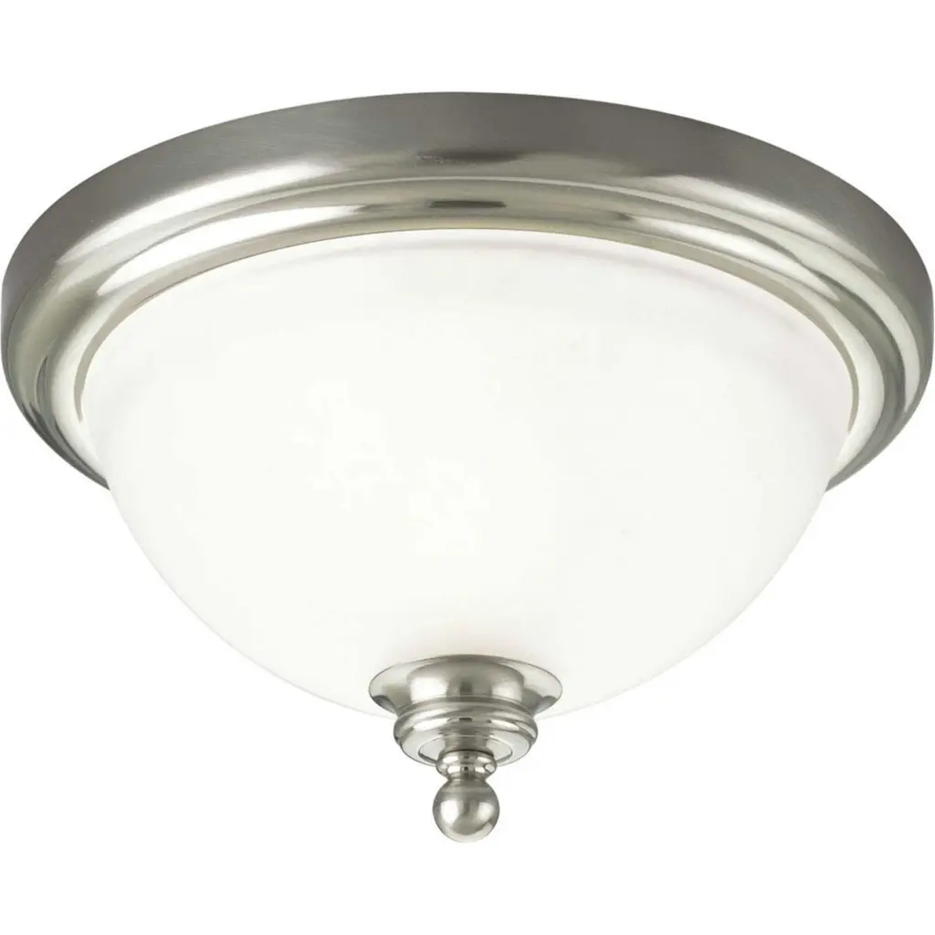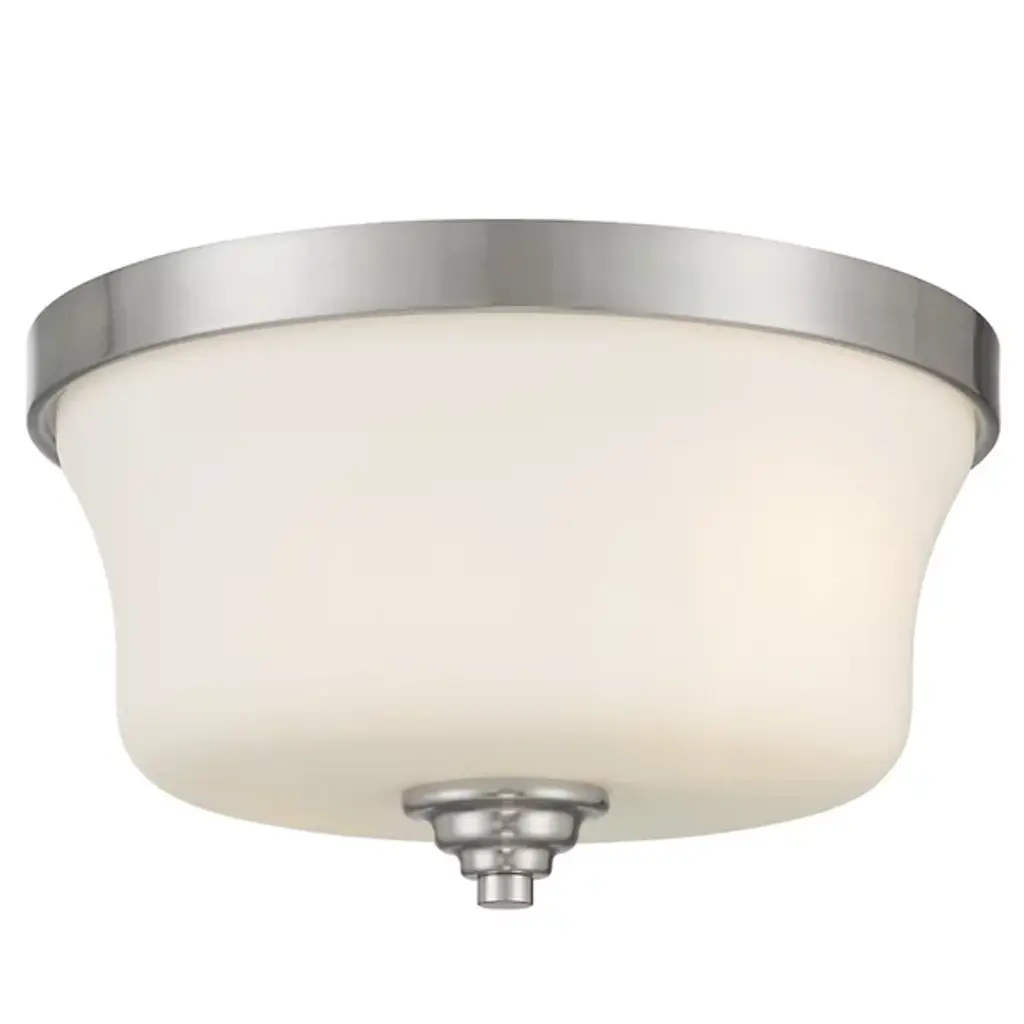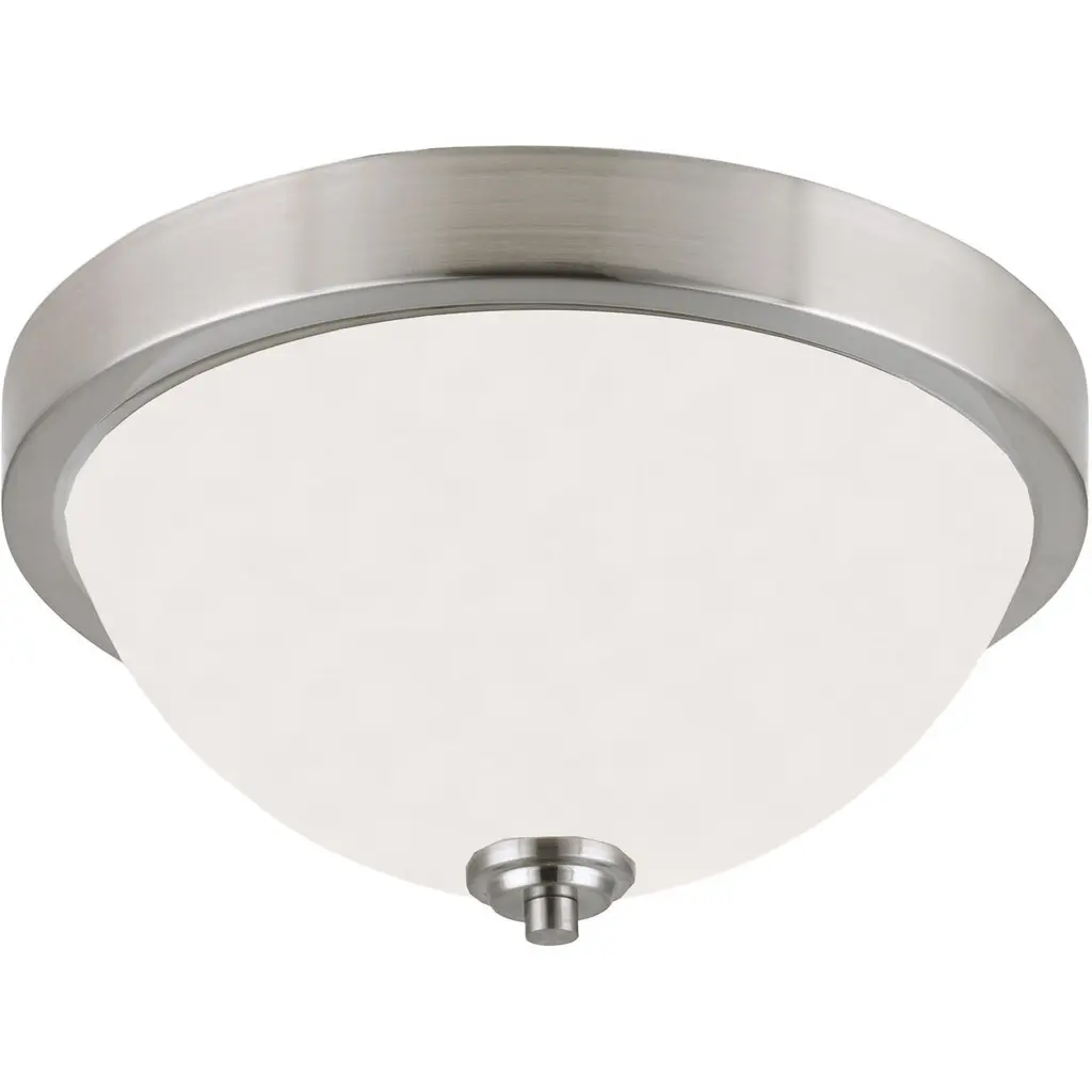 The graceful sweeping arms of the Brushed Nickel fixture synchronized with the elegant curves of the Matte Opal shades give the Ashton collection a classic yet contemporary presence. Bathroom/Bedroom/Dining Room/Dinette/Foyer/Game Room/Hallway/Kids Room/Kithcen/Kitchenette/Living Room/Office/Utility Room Shade Included: Yes Dimmable: Yes Material: Glass, Finish Color: Brushed Nickel, Width: 13", Height: 6.5", Hanging Method: Flush, Lamping Type: Incandescent, Number Of Bulbs: 2, Wattage: 60 Watts, Dimmable: Yes, Moisture Rating: Damp Rated