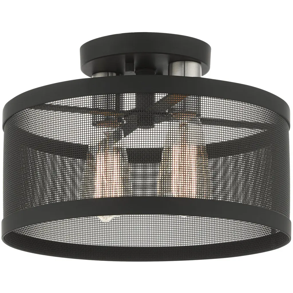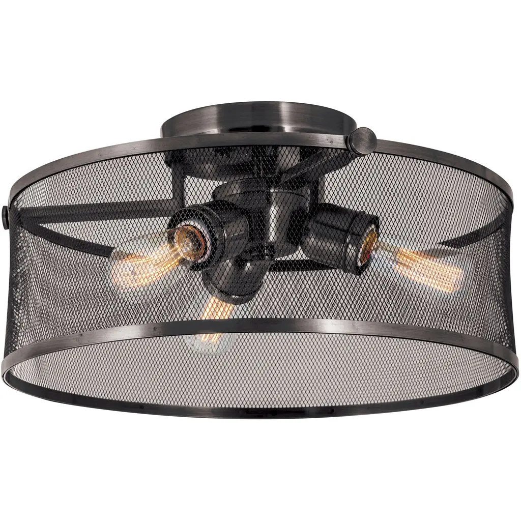 Bold yet sleek, the Meshsmith collection create a statement of contemporary minimalism with a mix of the vintage industrial. Vintage bulbs (included) glow behind the forged meshwork. Finishes include Brushed Nickel, Bronze, Chrome & Natural Brass. Bedroom/Dining Room/Foyer/Hallway/Kids Room/Kitchen/Living Room/Office/Utility Room Shade Included: Yes Dimmable: Yes Material: Steel, Finish Color: Brushed Nickel, Width: 21.13", Height: 6", Length: 21.125", Hanging Method: Flush, Lamping Type: Incandescent, Number Of Bulbs: 4, Wattage: 60 Watts, Dimmable: Yes, Moisture Rating: Dry Rated