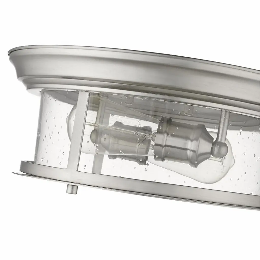 Cool industrial ambiance offers a stylish look to transitional spaces in need of functional, fashionable fixtures. With brilliant Chrome finish metal providing a circular cage-like frame and a wide cylindrical clear seedy glass shade completing its visual package, this two-light flush mount ceiling light offers a focal point in a redesigned space devoted to carefree living. Bedroom/Dining Room/Foyer/Hallway/Kids Room/Kitchen/Living Room/Office/Utility Room Shade Included: Yes Dimmable: Yes