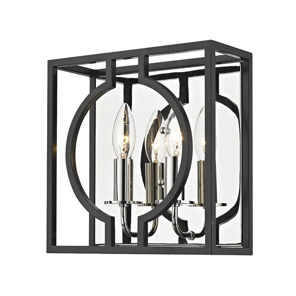 Contrasting finishes pad the extraordinary design of this four-light flush mount ceiling light. An architectural blend of rectangular shapes pairs a black steel frame with chrome finish bulb bases, and a surprisingly beautiful arrangement of candelabra-style bulbs that create a versatile contemporary and transitional dynamic. Bedroom/Dining Room/Foyer/Hallway/Kids Room/Kitchen/Living Room/Office/Utility Room Dimmable: Yes