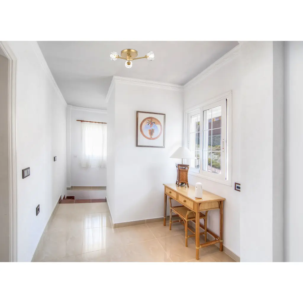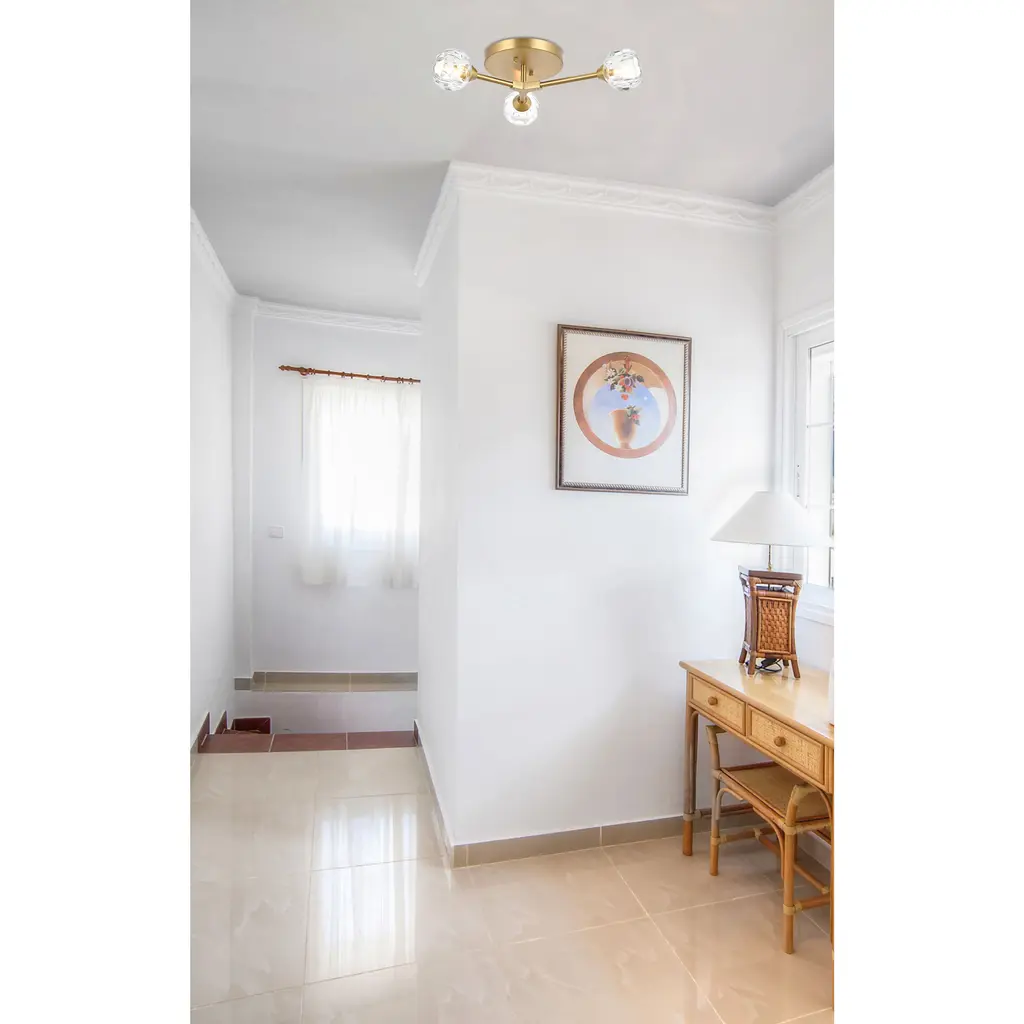 Crafted from iron metal and crystal, it features a round canopy and arms extended with solid K9 crystal ball from the rod on either side for a modern and linear look. Each 20W G9 bulb ( not included) is diffused by a faceted clear crystal ball giving the fixture a touch of industrial and glam inspiration. This work of art will add an artful focal point to your entryway, dining room, kitchen, or office. Evoking a sophisticated and timeless aesthetic to any space and will be an instant conversation started with its finely faceted crystal sphere which is polished by hand to reflect and refract light. Available in three different finishes in gold, chrome, and black.