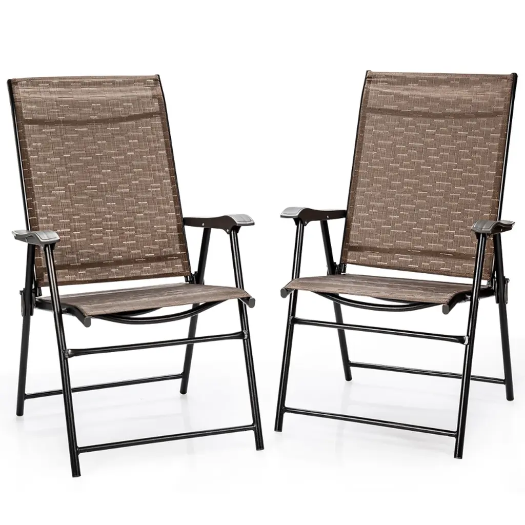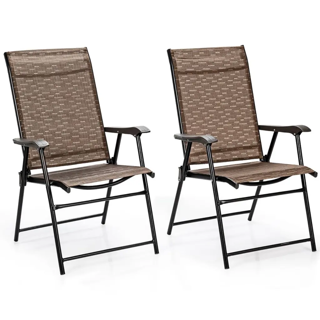 This folding chair is easy to carry and easily folds up for compact storage. it is designed for comfort and durability. It features lightweight, easy to clean and can be used indoors or out. With the folding chairs, it is a perfect way to just relax in your back garden or enjoy a camping trip outside. Do not hesitate to buy it!FeaturesSturdy and sturdy Lightweight and easy for transporting With folding feature, easy to store and save spaceSuitable for camping trips or just relaxing in your back gardenNo assembly requiredWeight capacity of each chair:330lbsColor: Brown Material: Steel, fabric Dimension of unfolding: 27” x 21” x 38” (L x W x H) Dimension of folding: 36” x 24” x 4” (L x W x H) Net weight: 22 lbs Maximum weight for each chair: 330 lbs Package includes: 2 x Patio dining chairs