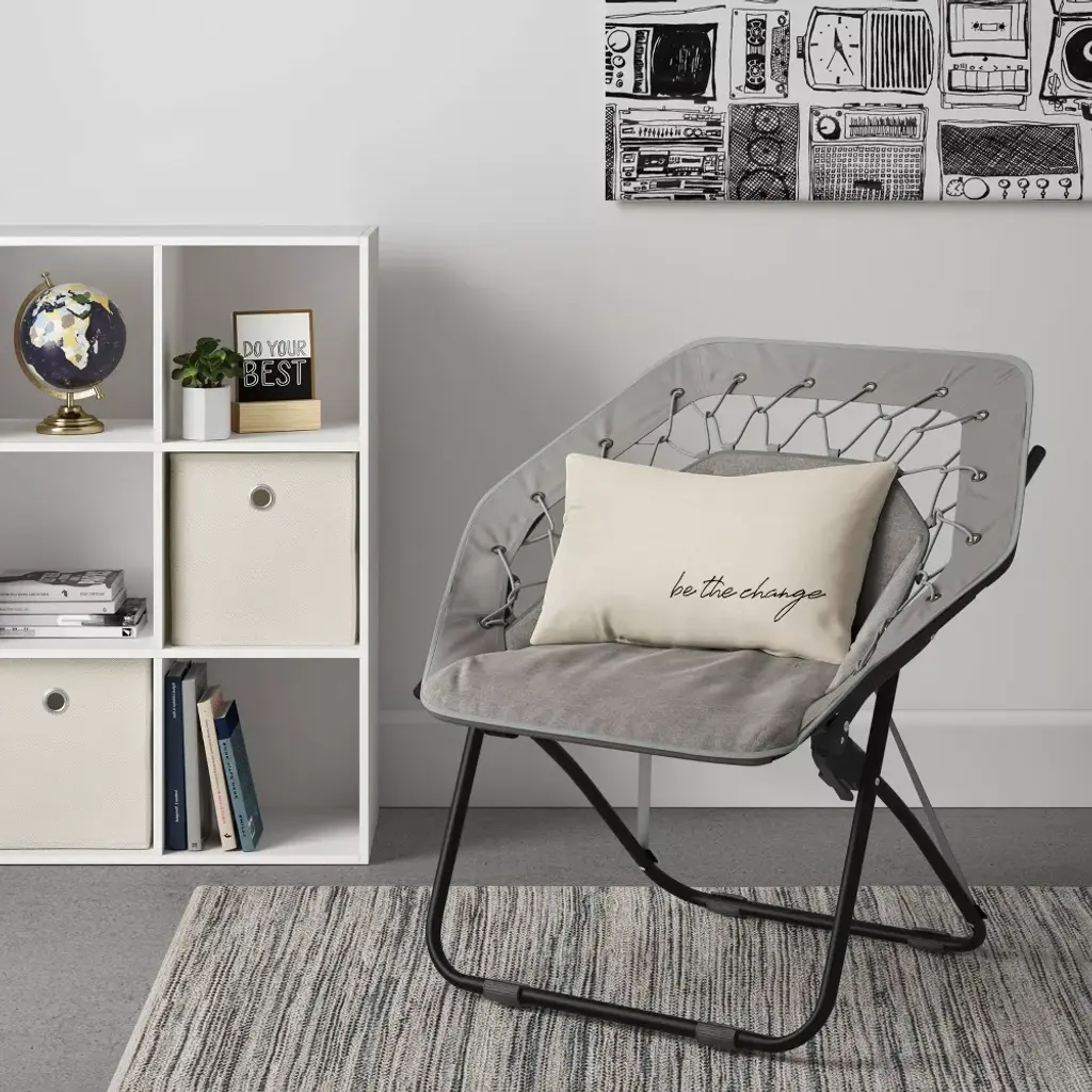 Add some fun to your lounging with this Hex Bungee Chair from Room Essentials™. This hexagon-shaped bungee chair makes a comfortable and contemporary addition to your indoor seating. It features a gray upholstered seat with a flexible cord woven design for soft support and breathable comfort. The black metal frame in a powder-coated finish provides durability and sturdiness, while the portable lightweight construction folds easily for compact storage. Place it in your family room or use it as a campaign chair when on the go for outdoor trips.