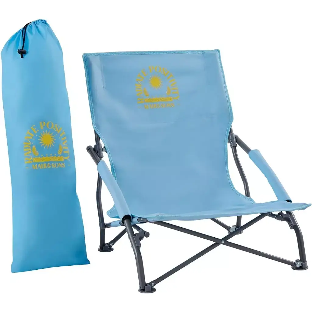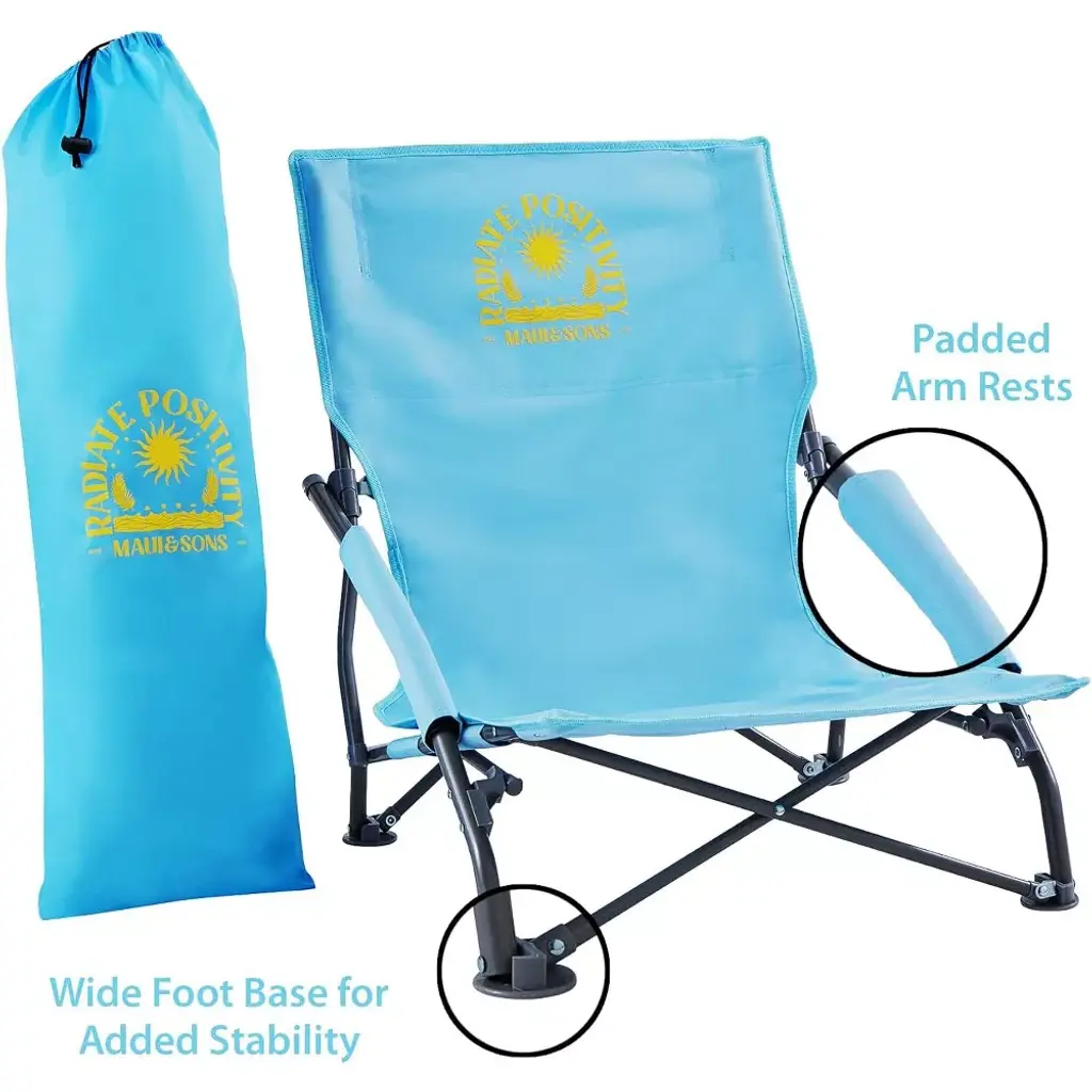 Enjoy a wonderful day outdoors with Maui and Sons Sling bag foldable chair. Light weight and easy to carry makes this awesome chair a great go to for all outdoor activities. Comes in great colors with the Maui and Sons RADIATE POSITIVITY logo as a reminder to enjoy all the moments and spread the joy. Folds easily and carries over shoulder with ease. Padded arm rest added for even more comfort. Weather coated fabric and powder coated steel make for a long lasting product that can be enjoyed for years!.