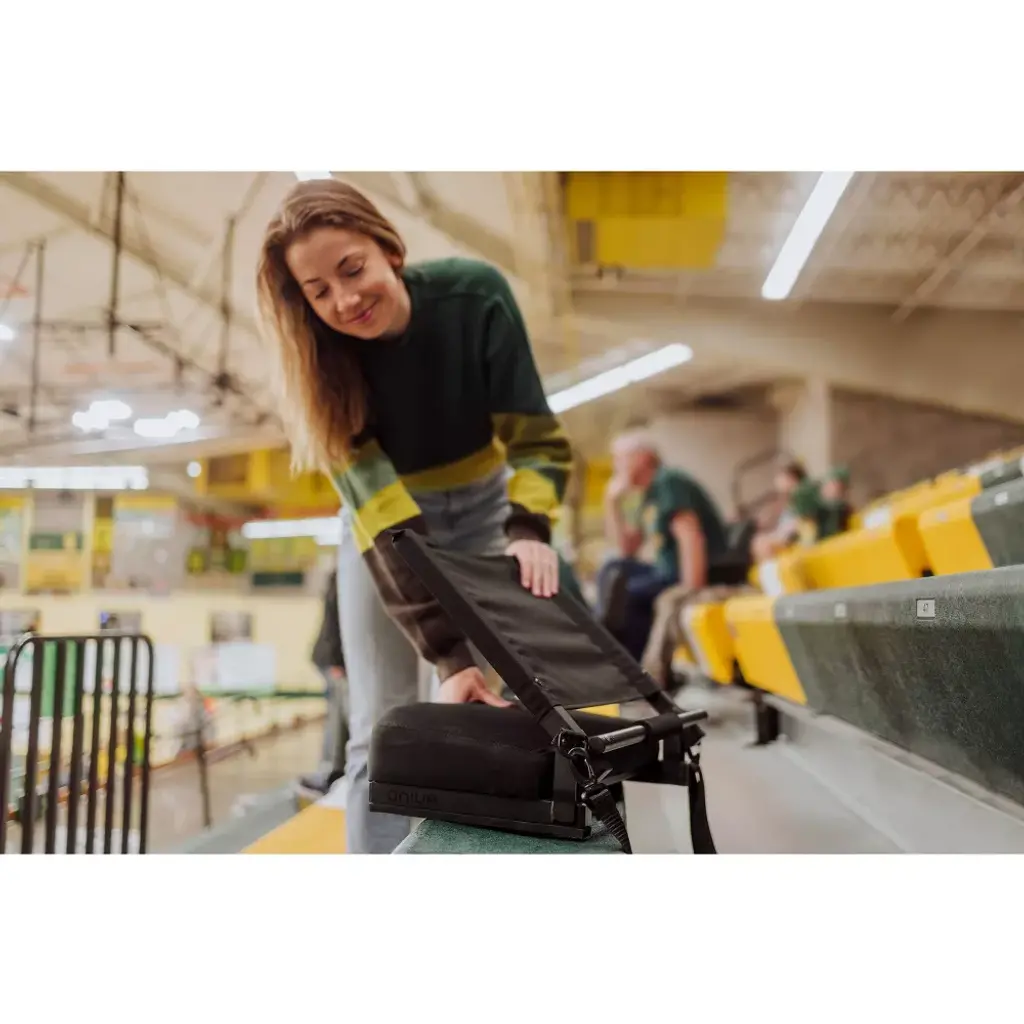 Gridiron Stadium Seat - Lightweight, Portable Folding Chair for Bleachers and Benches, (Heathered Gray)There’s nothing better than the big game - and there’s nothing worse than those hard, unforgiving bleachers. But with the Gridiron Stadium Seat, you’ll be kicking back in cozy comfort long after the second overtime! This sports chair is foldable for easy storage and features adjustable carry straps and cushioned handle bar so getting it from your car to the stadium is a breeze. There’s even an easy to use bleacher hook feature to keep your portable bleacher seat steady. With a lightweight and durable steel frame construction, you can look forward to plenty of good games in this high density foam folding stadium seat.1 Seat (18" x 14" x 17.75")Waterproof Polyester, Steel
