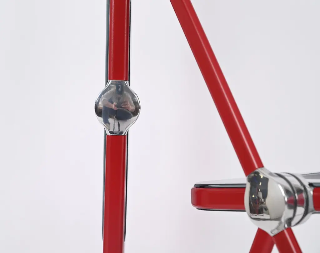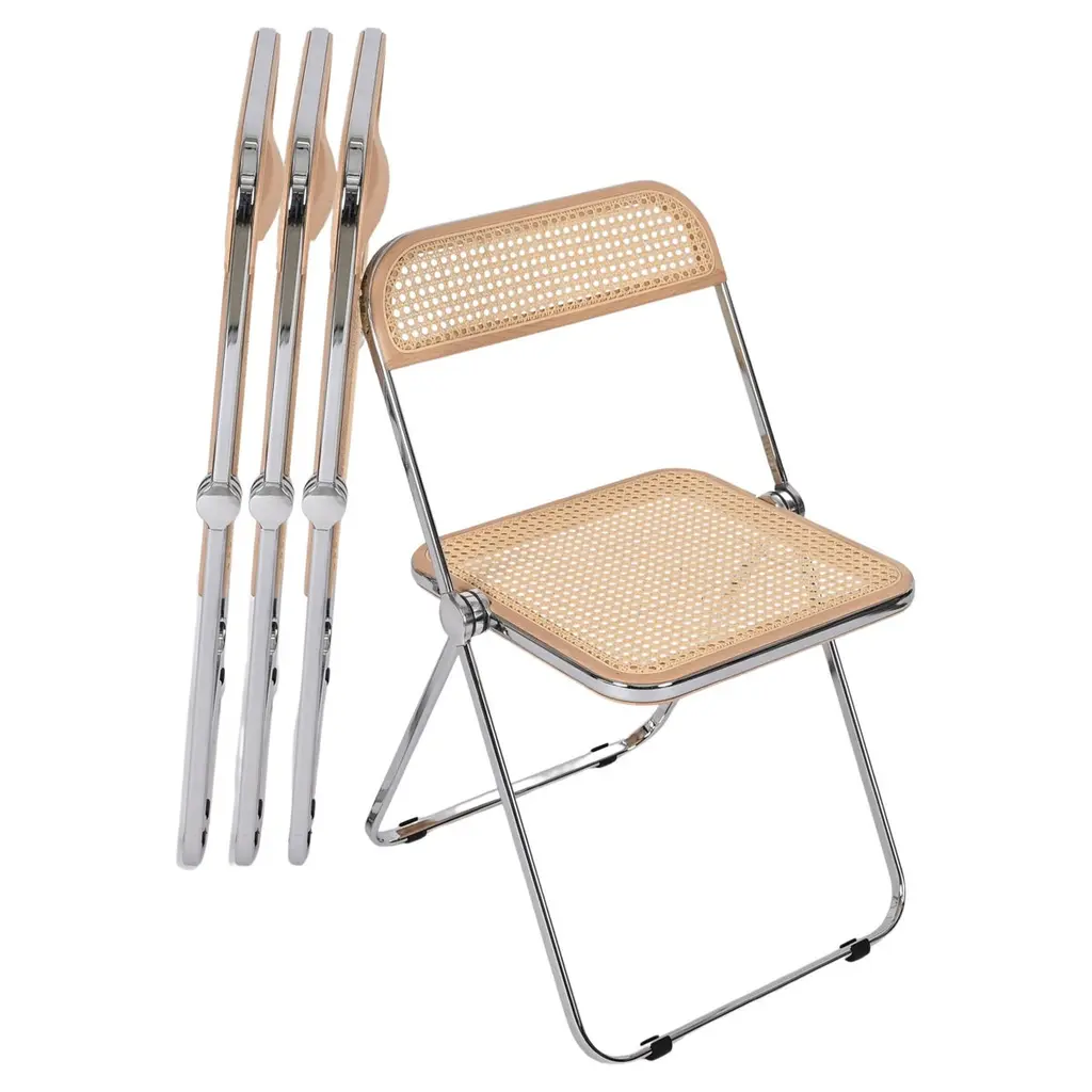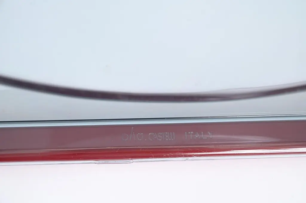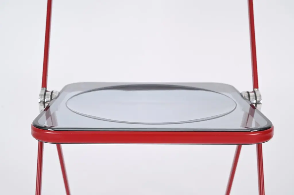 Fantastic set of 6 original and signed "Plia" chairs with a vibrant red metal structure and smoked lucite seat. In perfect conditions, NOS (new old stock). This fantastic set was designed by Giancarlo Piretti for Castelli in 1967.The contrast between the red structure and the smoked seat is incredibly charming and makes this folding chairs perfect for a Mid-Century Modern style project.PLIA, the symbol of a new era focused on plastic: this is how the plia chair from 1967 was welcomed when it was presented at the Salone del Mobile in Milan. on the occasion of the fair, the session received so much public acclaim that many visitors walked away from the stand taking samples without even asking for permission ... following this unorthodox compliment, the chairs were tied with a chain for safety.The "Plia" folding chair is a true design classic as it has won several awards and is also part of the MoMA collection. The "Plia" chair has a folding mechanism which allows the chair to be folded very flat so that it can be stored easily. Each chair in this set is signed and engraved with the manufacturer's mark. A multipurpose and iconic set that will be perfect for a modern or minimal project. Giancarlo Piretti was born in Bologna in 1940. He attended the Bologna State Institute of Art, where he obtained the title of Design Teacher. In 1960 he attended the Academy of Fine Arts in Bologna. Subsequently, for seven years, he was a lecturer in Industrial Design at the State Art Institute of Bologna. In the same period, for 12 years, he worked as an interior designer for Anonima Castelli, designing their lines of furniture for the home, office and community, for which he registered numerous industrial and mechanical invention patents. His best-known projects include PLIA, a folding chair, PLATONE, a folding table, DSC (106-AXIS), a seating system for collective and institutional spaces, and SISTEMA 61, a modular sofa system. Giancarlo Piretti participates in numerous Italian design competitions, obtaining prizes and special mentions. In 1971 he received the SMAU award and the BIO 5 Distinction at the Ljubljana biennial, Slovenia for Plia. In 1973 he was awarded, as always for PLIA, the GUTE FORM mention by the Chamber of Commerce of the Federal Republic of Germany, and a special mention by the British Government. In 1971 PLANO won the IBD gold medal (USA). For the VERTEBRA seating system: in 1977 he was awarded, together with Emilio Ambasz, the gold medal of BD (USA), the SMAU prize in 1979 and the Compasso d'Oro (Italy) in 1981. As always together with Ambasz, in 1980 receives the "National Industrial Design Award" (USA) for LOGOTEC, a lighting system. In 1975 Giancarlo Piretti was appointed member of the Scientific-Didactic Committee of the Higher Institute for Artistic Industries of Florence. His work is often published in numerous international journals.