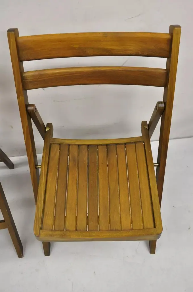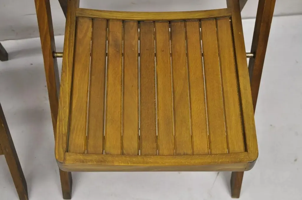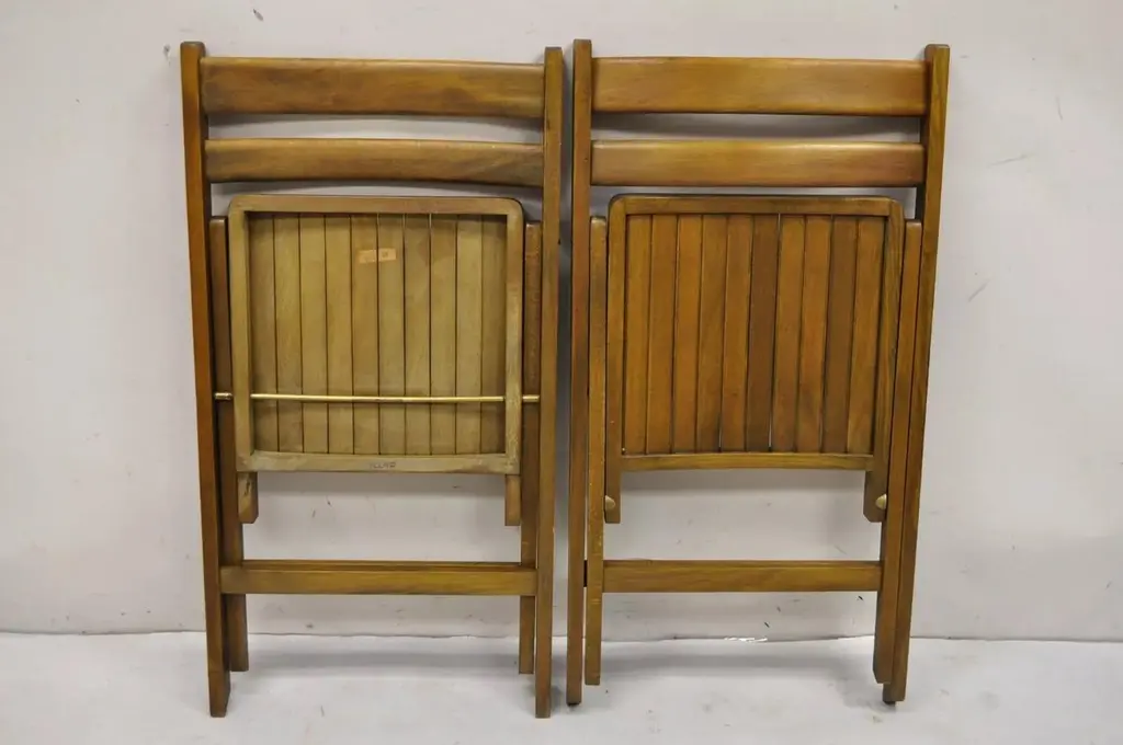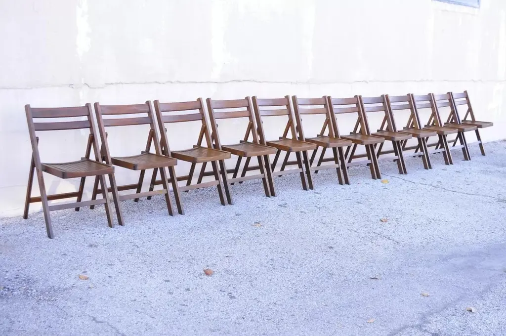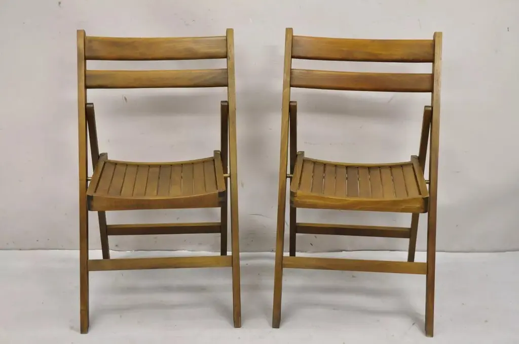 Vintage Mid Century Modern Solid Wood Slatted Folding Chairs - Set Of 6. 2 Sets of 6 available. Circa Mid 20th Century. Measurements: Chair opened: 31.5" H x 18" W x 21" D x 17.5" Seat Height. Chair folded: 35" H x 18" W x 2" D.