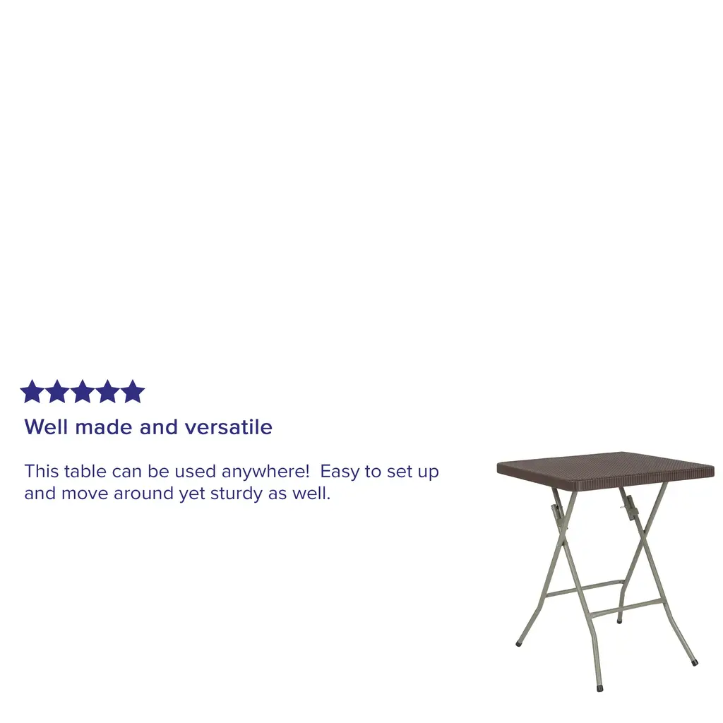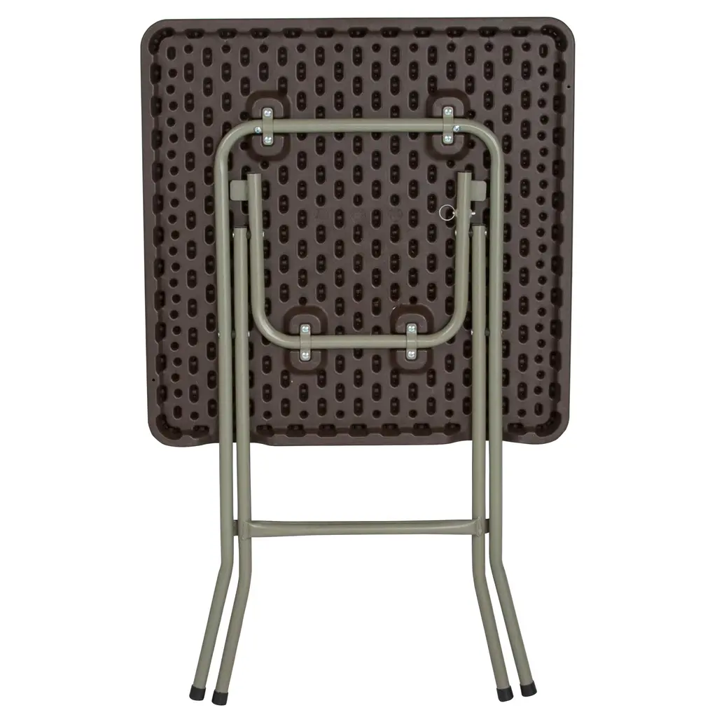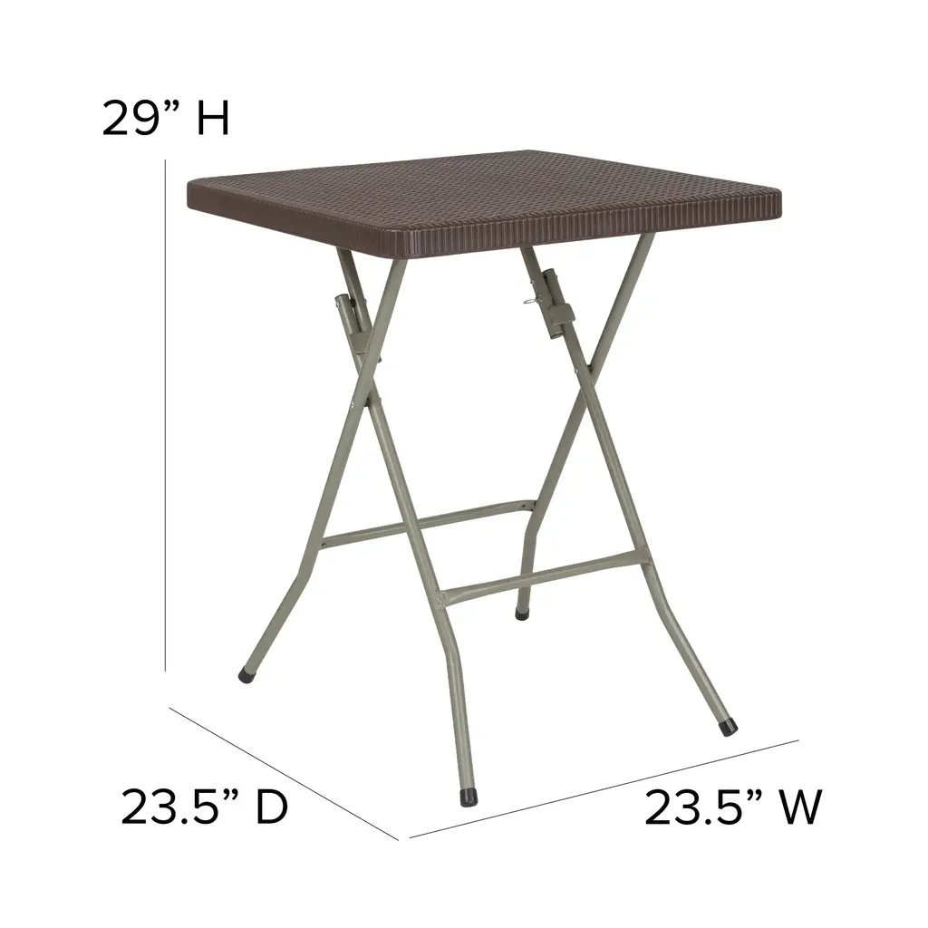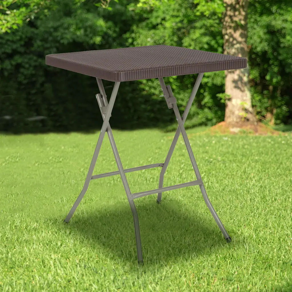 This petite sized, rattan-style folding table will add some pizzazz to your indoor or outdoor dining setting.This plastic folding table is a great option when you need a temporary dining surface or an everyday patio setup. The rattan weave top features a decorative straight-lined border, is 1.5 inches thick, and will seat up to two adults. Table is commercial rated for use in banquet halls and patios. Table legs fold under the table to make storage more convenient and for better portability.Designed for both indoor and outdoor use, this plastic folding table is a convenient option for your home or business.