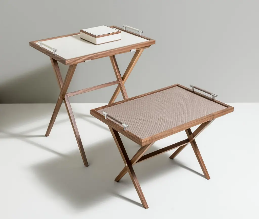 We have combined the practicality of a removable tray and foldable legs with the elegance of essential lines.Dedalo is our side table made with a walnut wood structure refined with a soft leather surface. Available in a short and tall size these refined side tables will stand out next to a sofa or armchair.